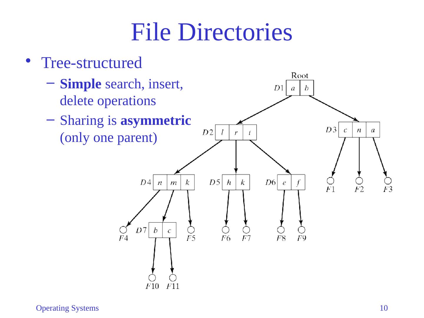 10 .Operating Systems 10 File Directories Tree-structured Simple search, insert, delete operations Sharing is asymmetric (only one parent)