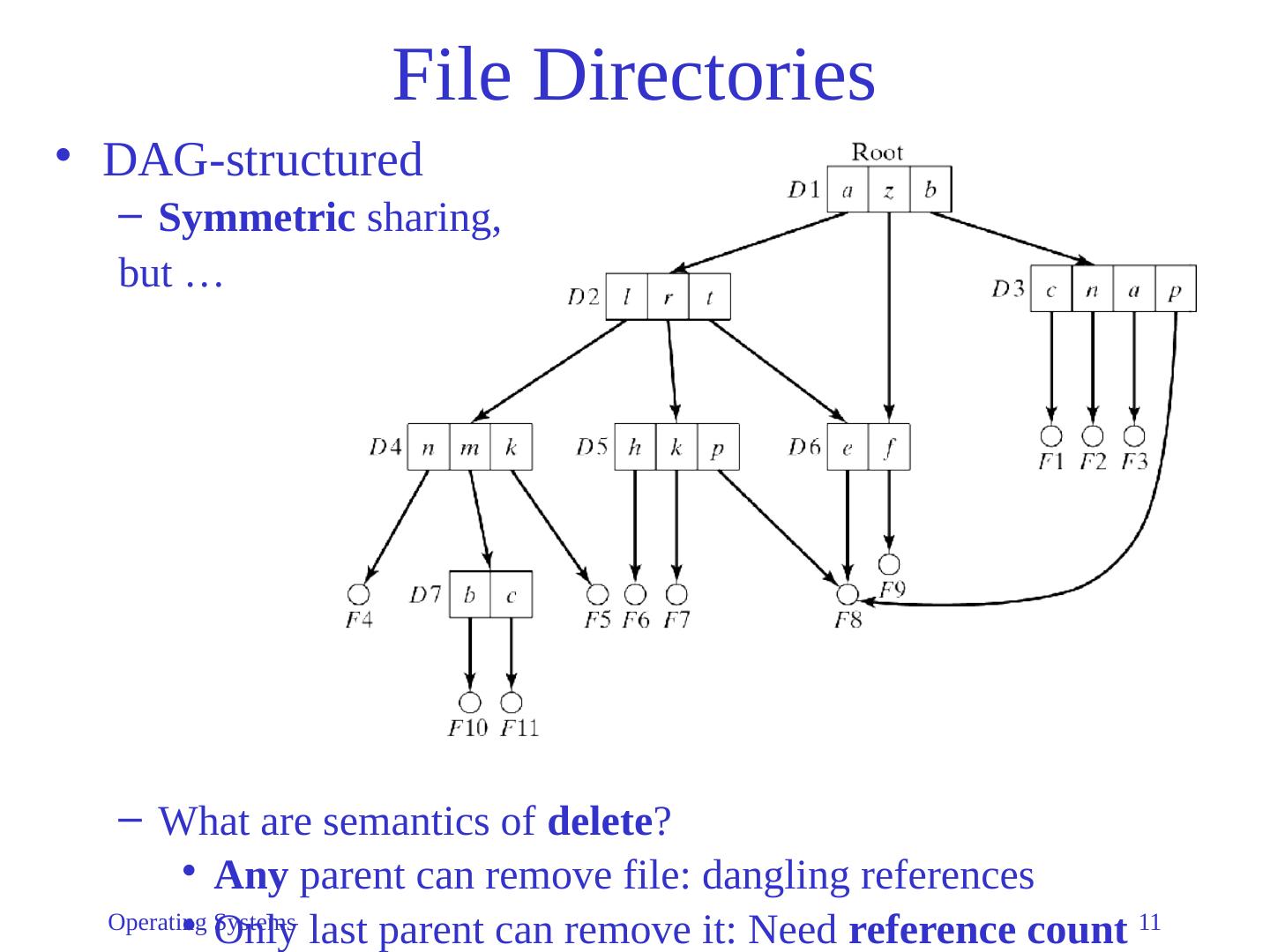 11 .Operating Systems 11 File Directories DAG-structured Symmetric s haring, but … What are semantics of delete ? Any parent can remove file: dangling references Only last parent can remove it: Need reference count