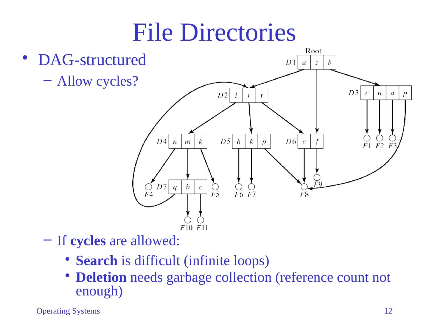 12 .Operating Systems 12 File Directories DAG-structured Allow cycles ? If cycles are allowed: Search is difficult (infinite loops) Deletion needs garbage collection (reference count not enough)