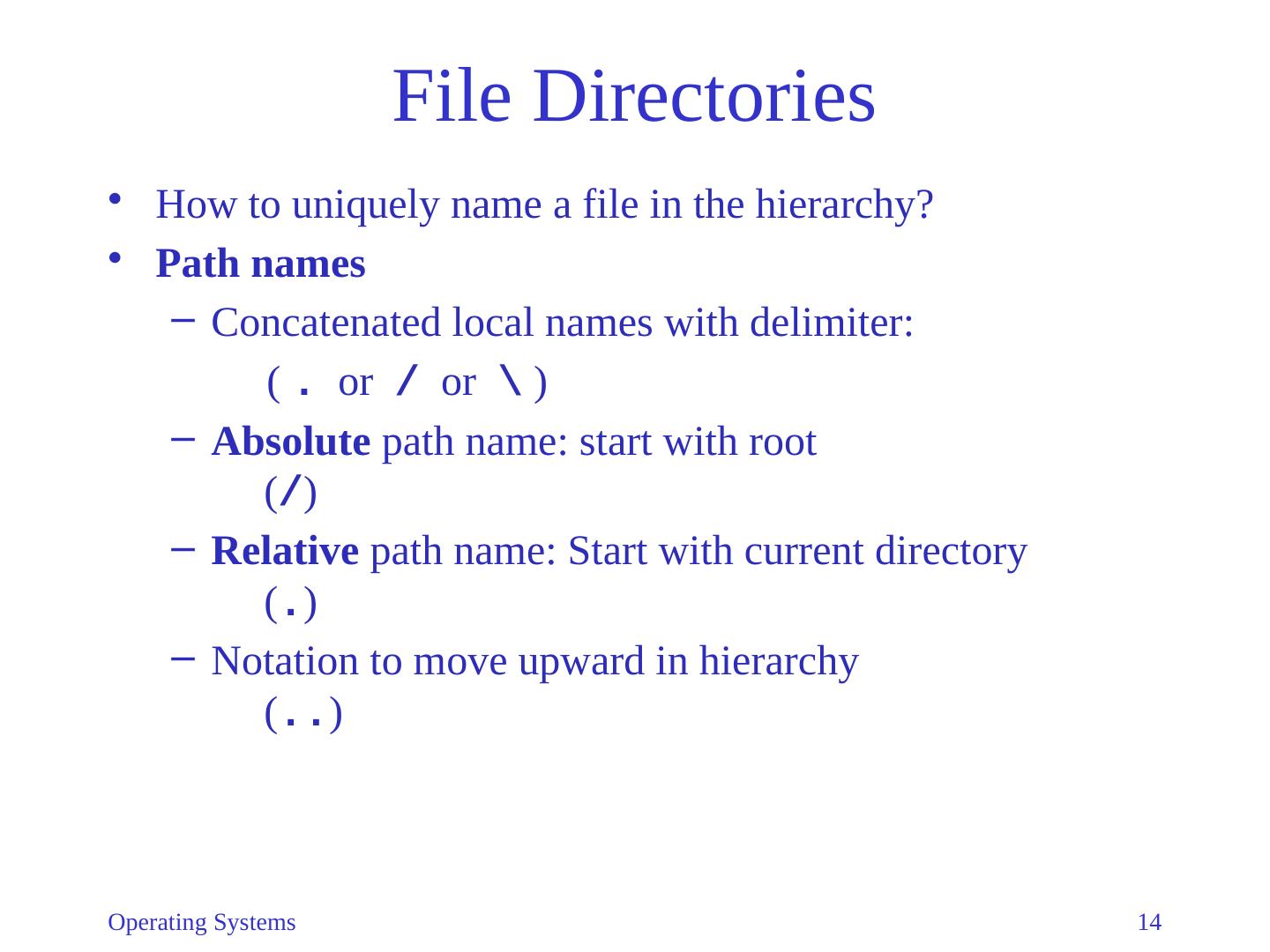 14 .Operating Systems 14 File Directories How to uniquely name a file in the hierarchy? Path names Concatenated local names with delimiter: ( . or / or \ ) Absolute path name: start with root ( / ) Relative path name: Start with current directory ( . ) Notation to move upward in hierarchy ( .. )