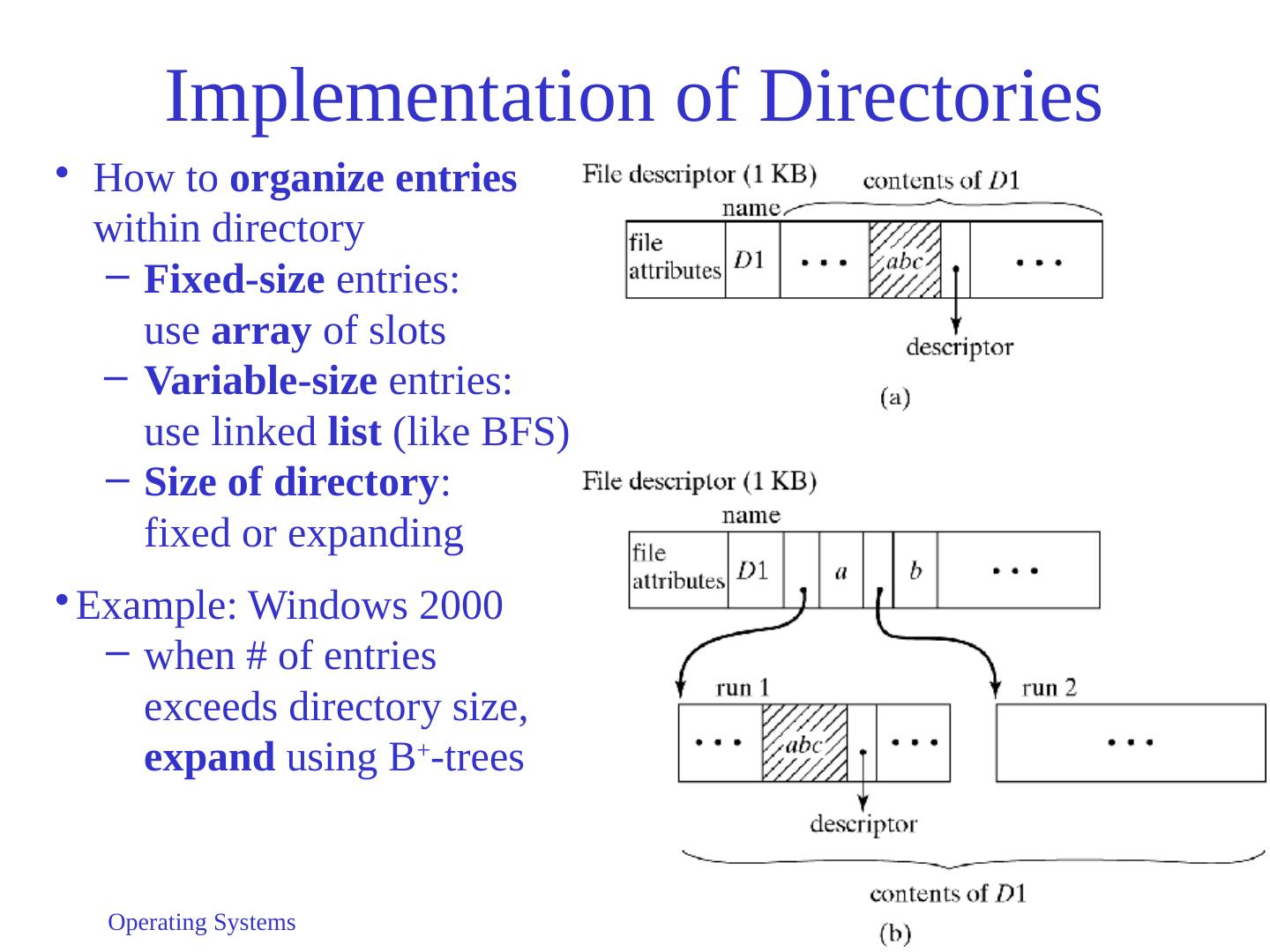 18 .Operating Systems 18 Implementation of Directories How to organize entries within directory Fixed-size entries: use array of slots Variable-size entries: use linked list (like BFS) Size of directory : f ixed or expanding Example: Windows 2000 w hen # of entries exceeds directory size, expand using B + - trees