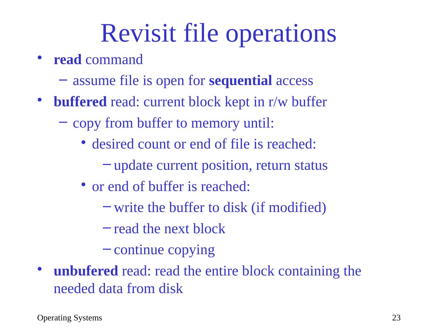23 .Operating Systems 23 Revisit file operations read command assume file is open for sequential access buffered read: current block kept in r/w buffer copy from buffer to memory until: desired count or end of file is reached: update current position, return status or end of buffer is reached: write the buffer to disk (if modified) read the next block continue copying u nbufered read: read the entire block containing the needed data from disk