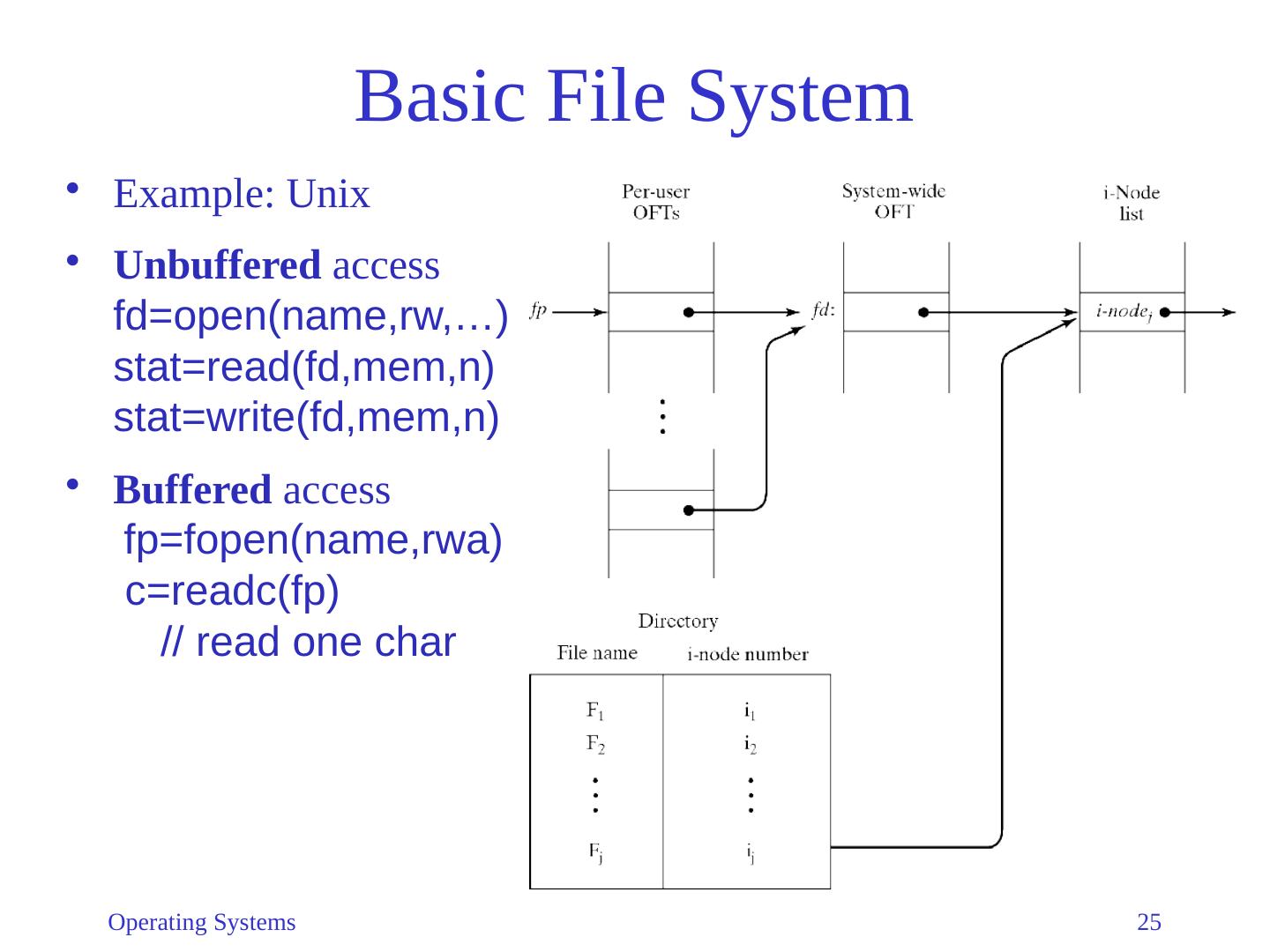 25 .Operating Systems 25 Basic File System Example: Unix Unbuffered access fd =open( name,rw ,…) stat=read( fd,mem,n ) stat=write( fd,mem,n ) Buffered access fp = fopen ( name,rwa ) c= readc ( fp ) // read one char