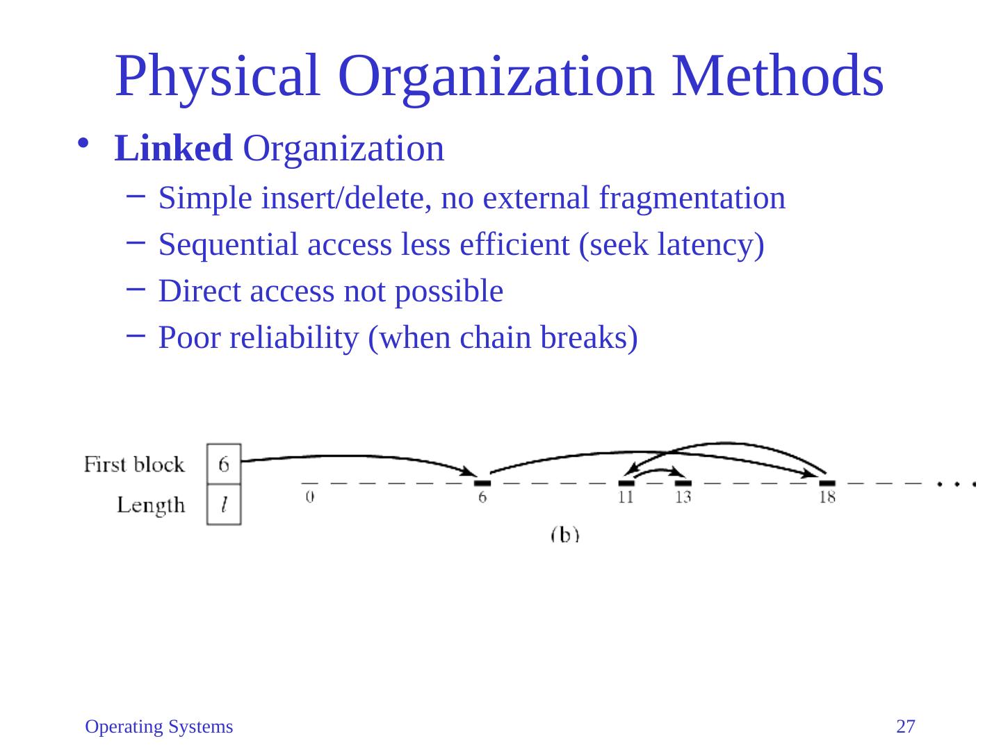 27 .Operating Systems 27 Physical Organization Methods Linked Organization Simple insert/delete, no external fragmentation Sequential access less efficient (seek latency) Direct access not possible Poor reliability (when chain breaks)