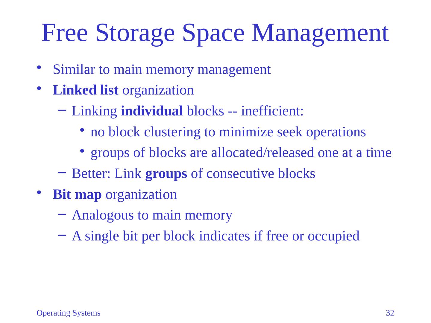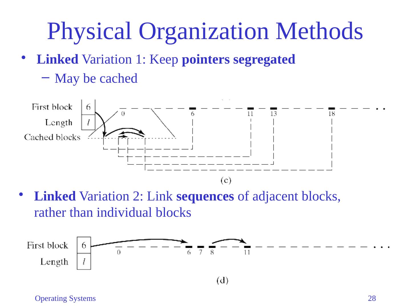 28 .Operating Systems 28 Physical Organization Methods Linked Variation 1: Keep pointers segregated May be cached Linked Variation 2: Link sequences of adjacent blocks, rather than individual blocks
