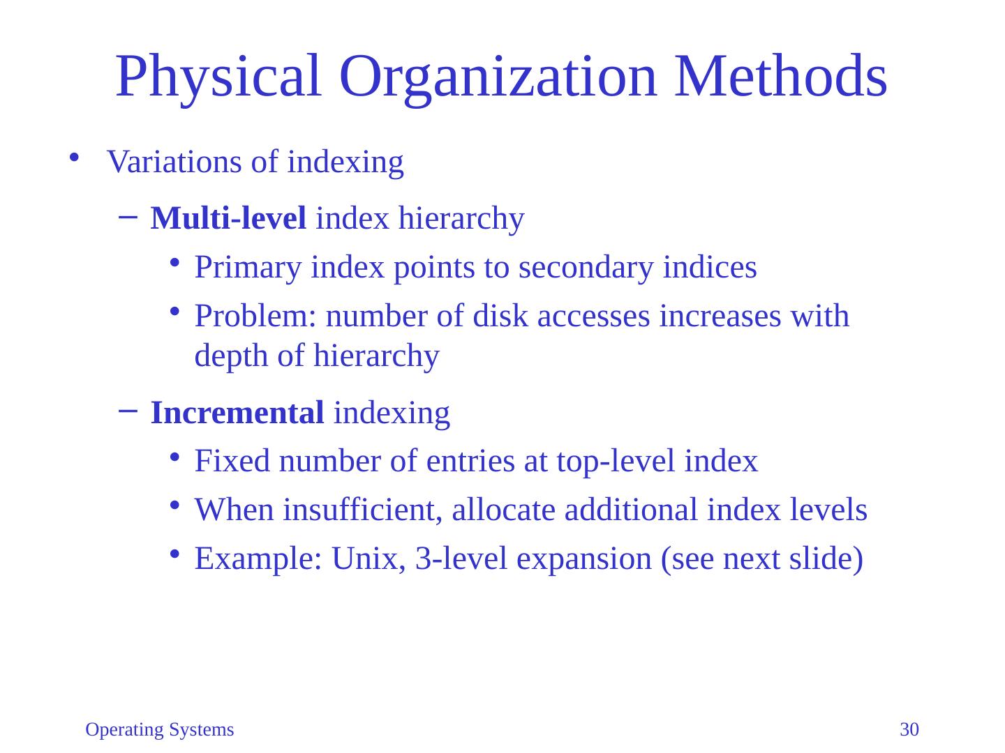 29 .Operating Systems 29 Physical Organization Methods Indexed Organization Index table: sequential list of records Simplest implementation: keep index list in descriptor Insert/delete is easy Sequential and direct access is efficient Drawback: file size limited by number of index entries