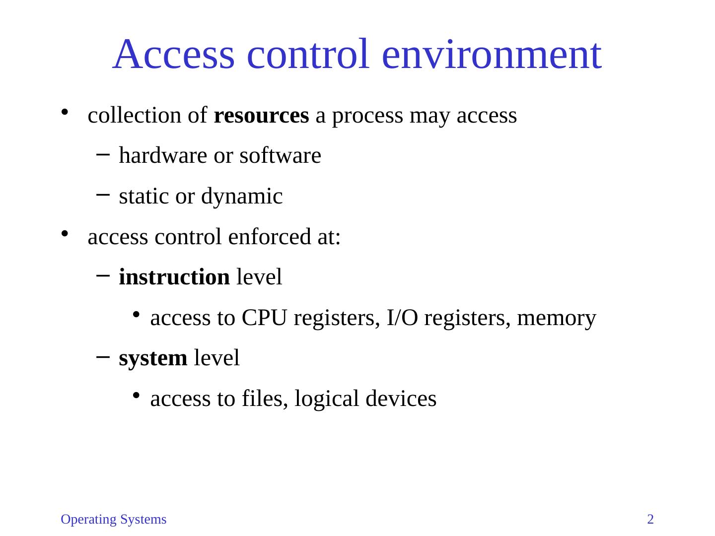 2 .Operating Systems 2 Access control environment collection of resources a process may access hardware or software static or dynamic access control enforced at: instruction level access to CPU registers, I/O registers, memory system level access to files, logical devices