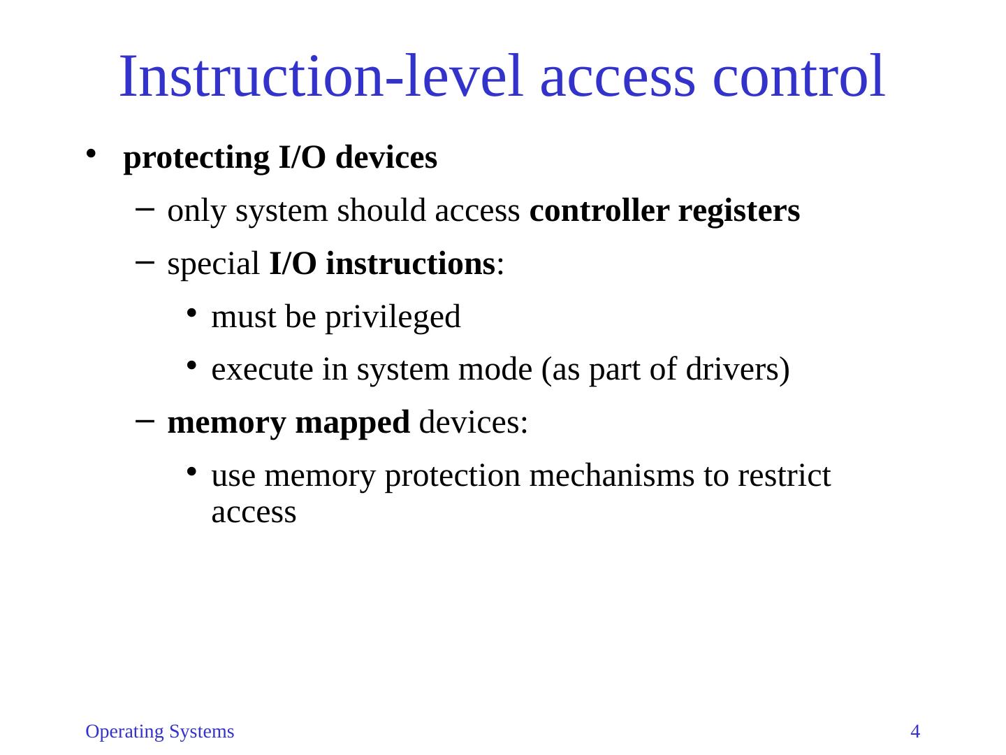 4 .Operating Systems 4 Instruction-level access control p rotecting I/O devices only system should access controller registers special I/O instructions : must be privileged execute in system mode (as part of drivers) memory mapped devices: use memory protection mechanisms to restrict access