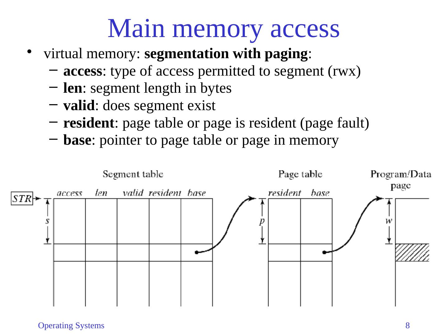 8 .Operating Systems 8 Main memory access virtual memory: segmentation with paging : access : type of access permitted to segment ( rwx ) len : segment length in bytes valid : does segment exist resident : page table or page is resident (page fault) base : pointer to page table or page in memory