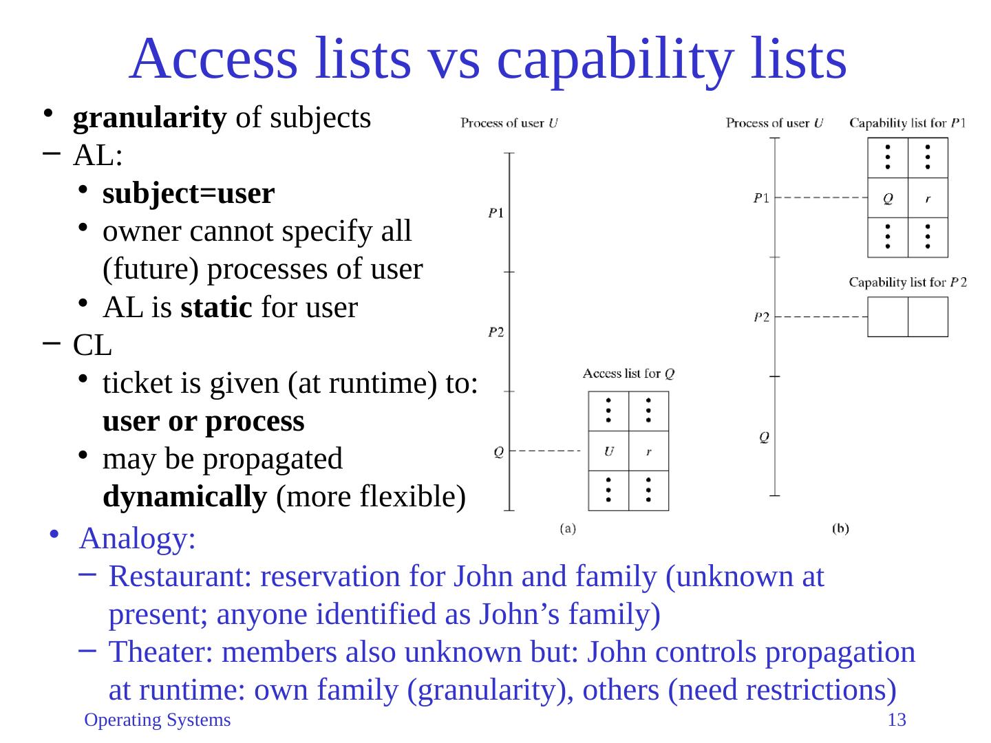 13 .Operating Systems 13 Access lists vs capability lists granularity of subjects AL: subject=user owner cannot specify all (future) processes of user AL is static for user CL ticket is given (at runtime) to: user or process may be propagated dynamically (more flexible) Analogy: Restaurant: reservation for John and family (unknown at present; anyone identified as John’s family) Theater: members also unknown but: John controls propagation at runtime: own family (granularity), others (need restrictions)