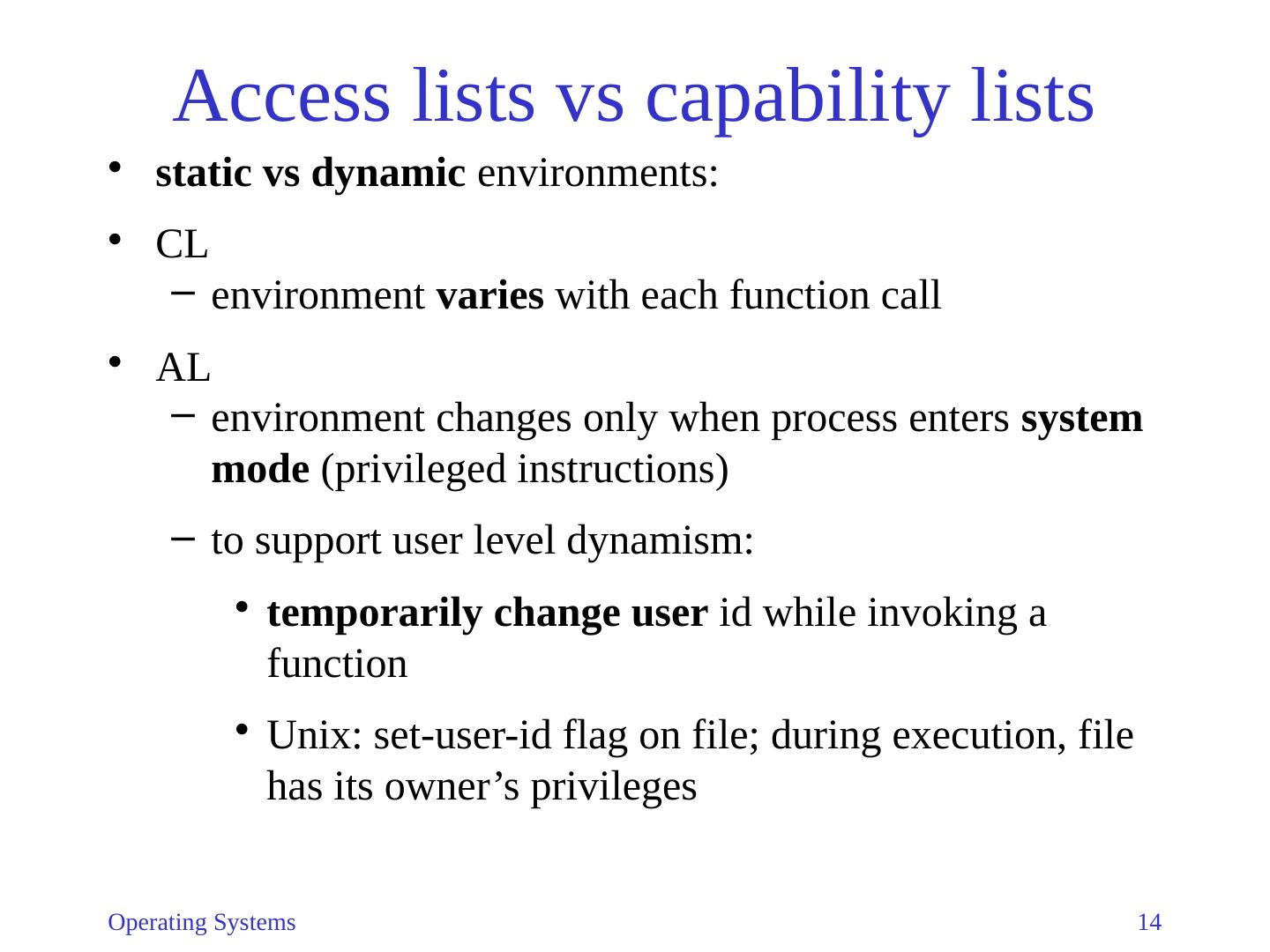 14 .Operating Systems 14 Access lists vs capability lists static vs dynamic environments: CL environment varies with each function call AL environment changes only when process enters system mode (privileged instructions) to support user level dynamism: temporarily change user id while invoking a function Unix: set-user-id flag on file; during execution, file has its owner’s privileges