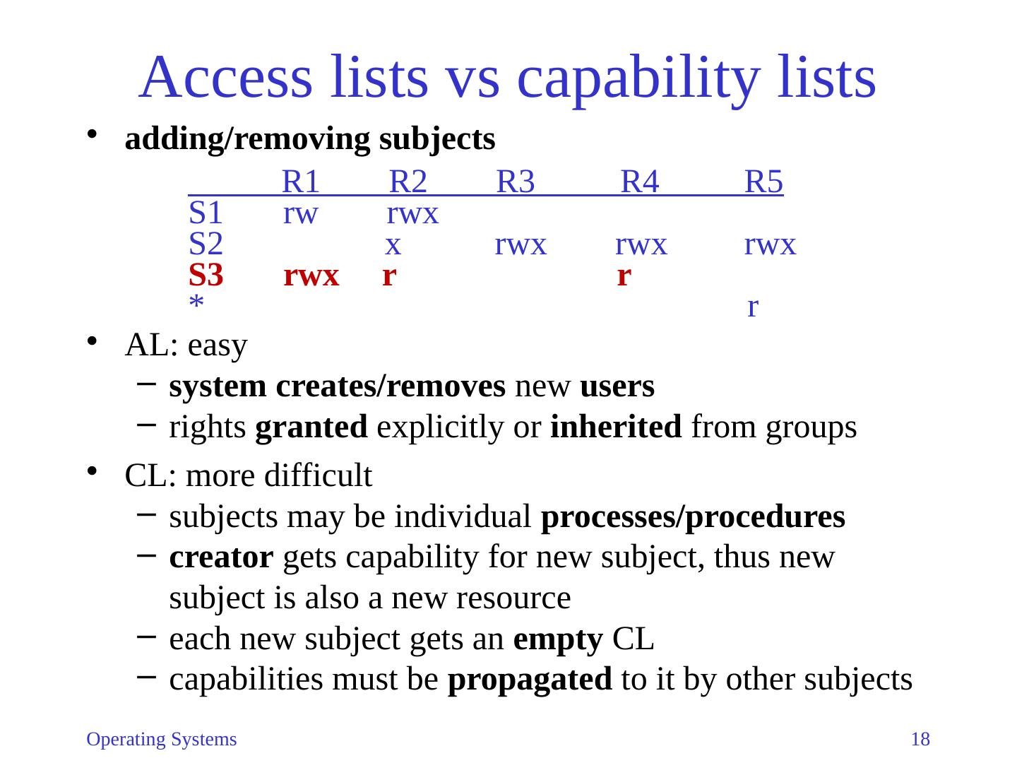 16 .Operating Systems 16 Access lists vs capability lists Unix : 3 levels: owner, group, other Multics : segment in ring i may r/w segment in j, if i j segment in i may call segment in j, if: i j ; parameters must be copied to ring j j<i and called segment in j specifies a limit k where ik linear ordering of all accesses is very limiting