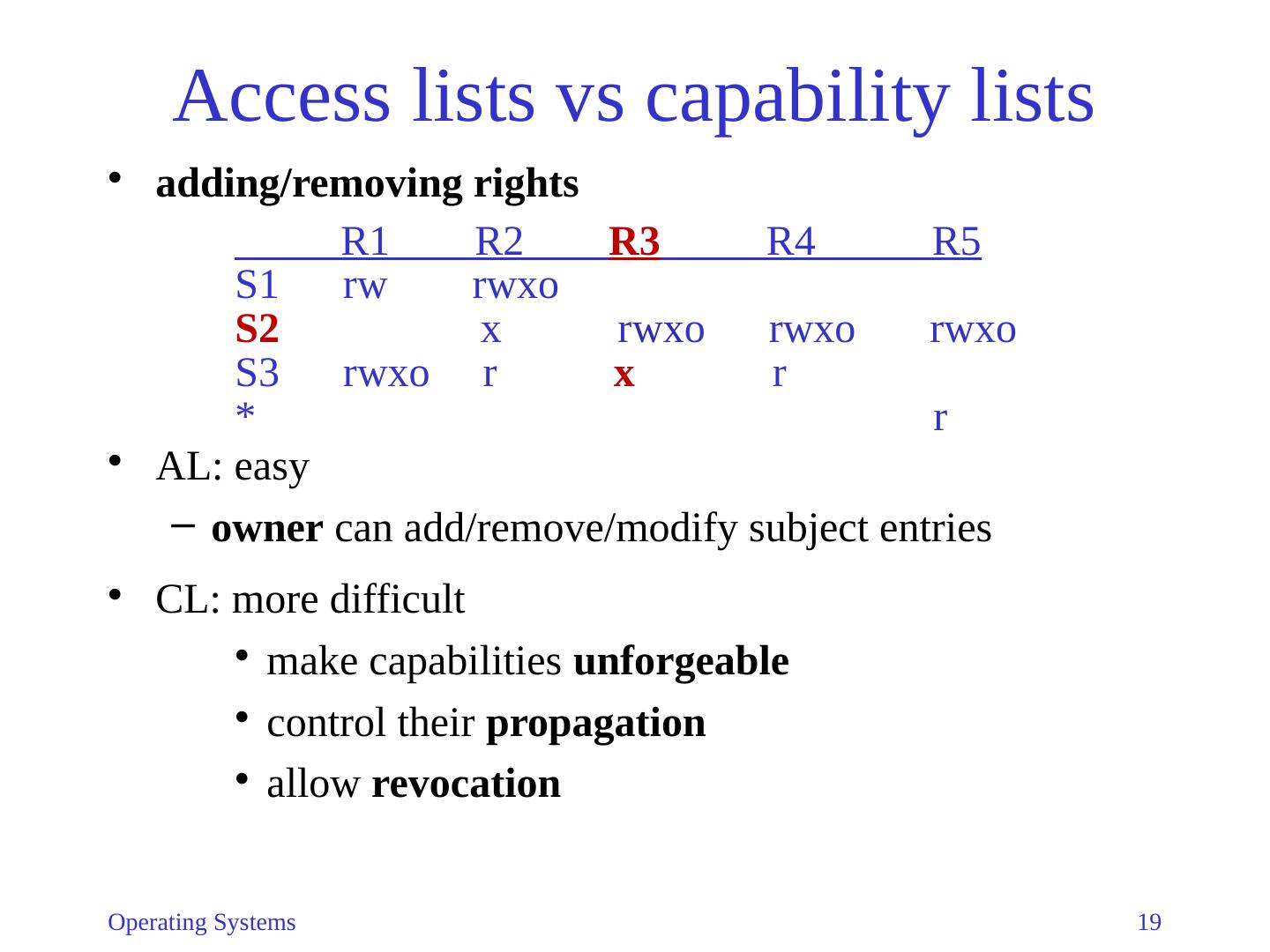 18 .Operating Systems 18 Access lists vs capability lists adding/removing subjects R1 R2 R3 R4 R5 S1 rw rwx S2 x rwx rwx rwx S3 rwx r r * r AL: easy system creates/removes new users rights granted explicitly or inherited from groups CL: more difficult subjects may be individual processes/procedures creator gets capability for new subject, thus new subject is also a new resource each new subject gets an empty CL capabilities must be propagated to it by other subjects