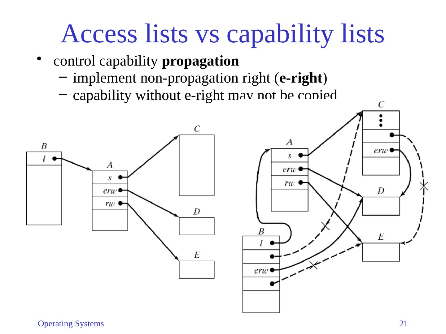 21 .Operating Systems 21 Access lists vs capability lists control capability propagation implement non-propagation right ( e-right ) capability without e-right may not be copied