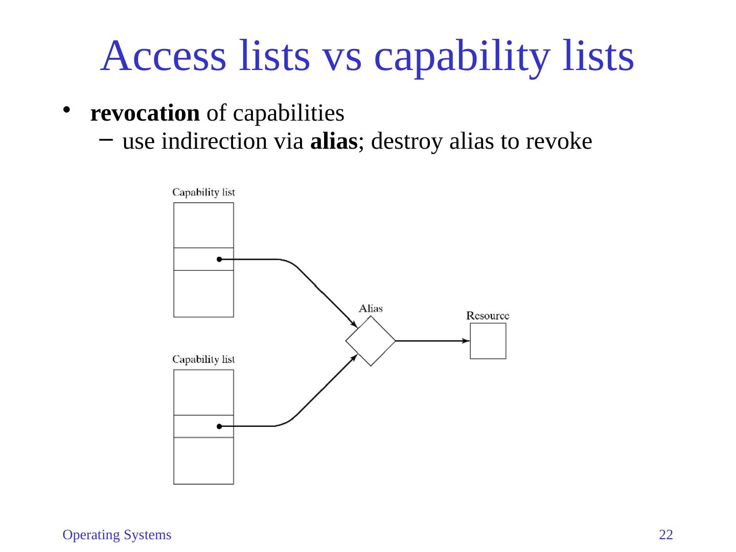22 .Operating Systems 22 Access lists vs capability lists revocation of capabilities use indirection via alias ; destroy alias to revoke
