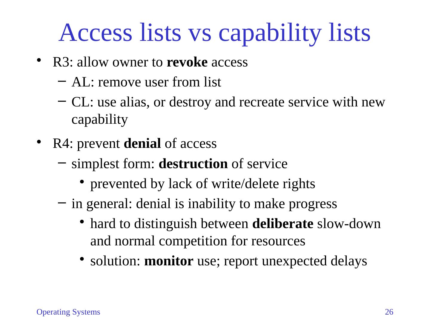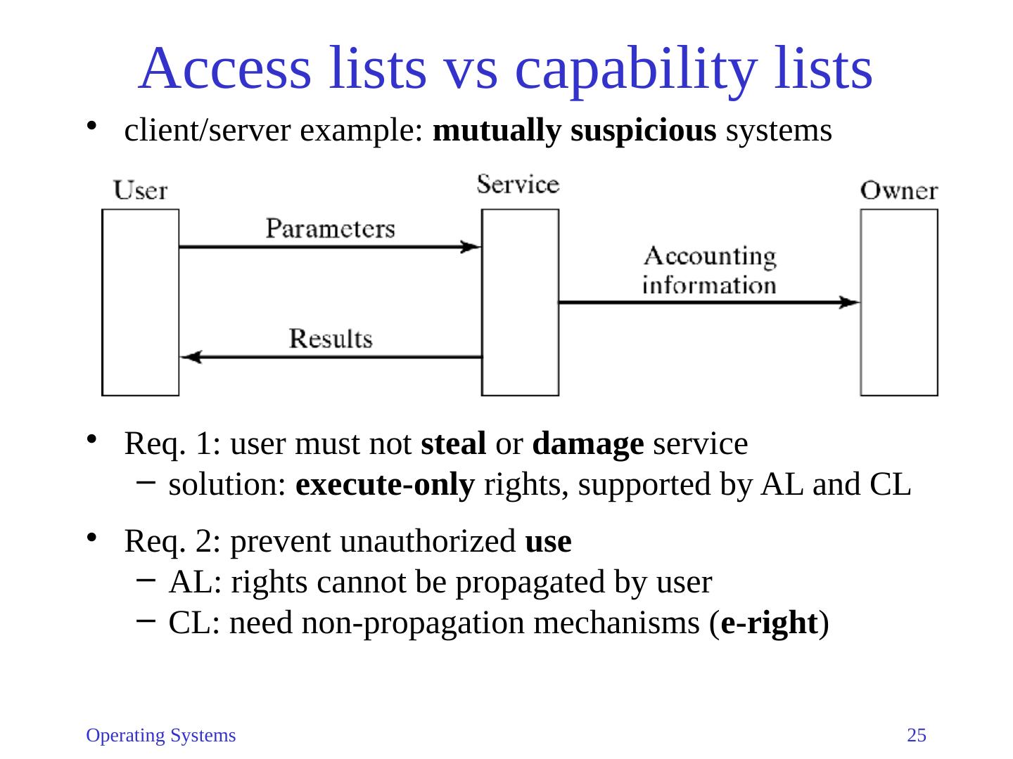 25 .Operating Systems 25 Access lists vs capability lists client/server example: mutually suspicious systems Req. 1: user must not steal or damage service solution: execute-only rights, supported by AL and CL Req. 2: prevent unauthorized use AL: rights cannot be propagated by user CL: need non-propagation mechanisms ( e-right )