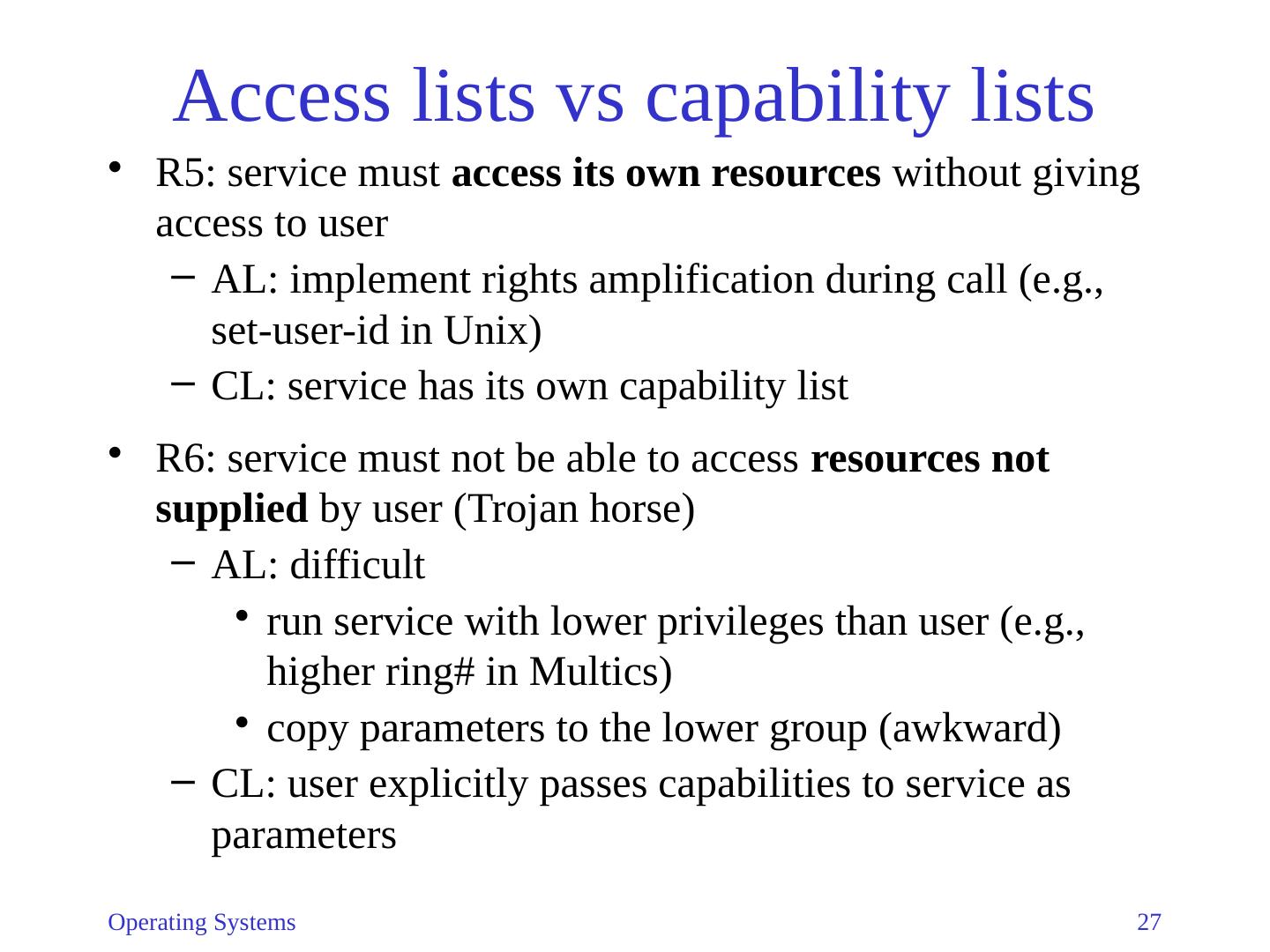 27 .Operating Systems 27 Access lists vs capability lists R5: service must access its own resources without giving access to user AL: implement rights amplification during call (e.g., set-user-id in Unix) CL: service has its own capability list R6: service must not be able to access resources not supplied by user (Trojan horse) AL: difficult run service with lower privileges than user (e.g., higher ring# in Multics ) copy parameters to the lower group (awkward) CL: user explicitly passes capabilities to service as parameters