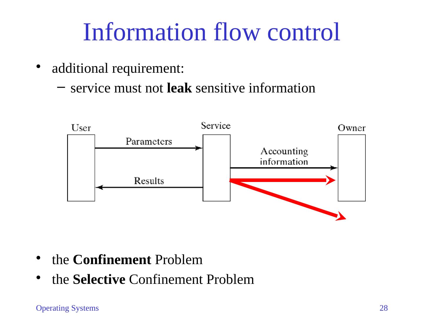 28 .Operating Systems 28 Information flow control additional requirement: service must not leak sensitive information the Confinement Problem the Selective Confinement Problem