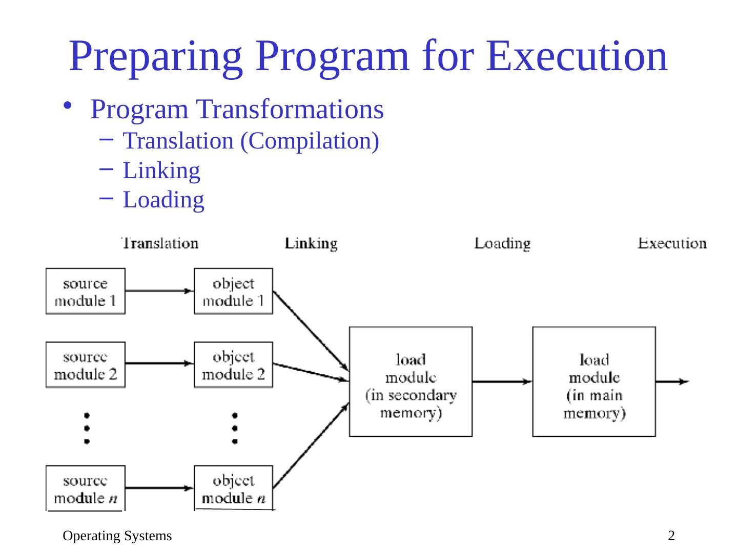 2 .Operating Systems 2 Preparing Program for Execution Program Transformations Translation (Compilation) Linking Loading