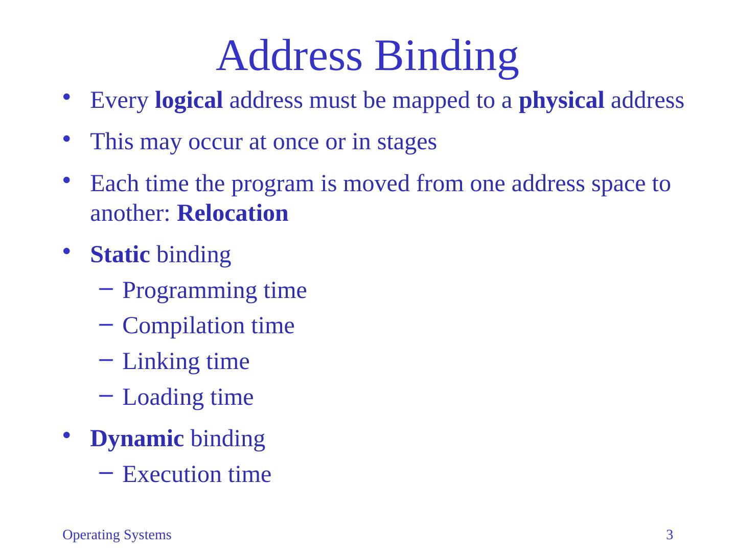 3 .Operating Systems 3 Address Binding Every logical address must be mapped to a physical address This may occur at once or in stages Each time the program is moved from one address space to another: Relocation Static binding Programming time Compilation time Linking time Loading time Dynamic binding Execution time
