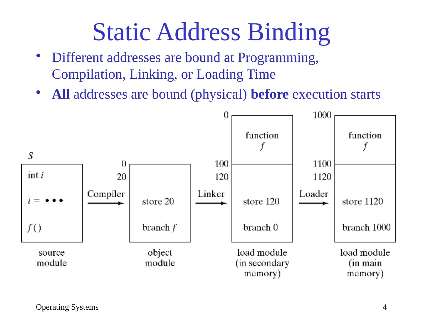 4 .Operating Systems 4 Static Address Binding Different addresses are bound at Programming, Compilation, Linking, or Loading Time All addresses are bound (physical) before execution starts