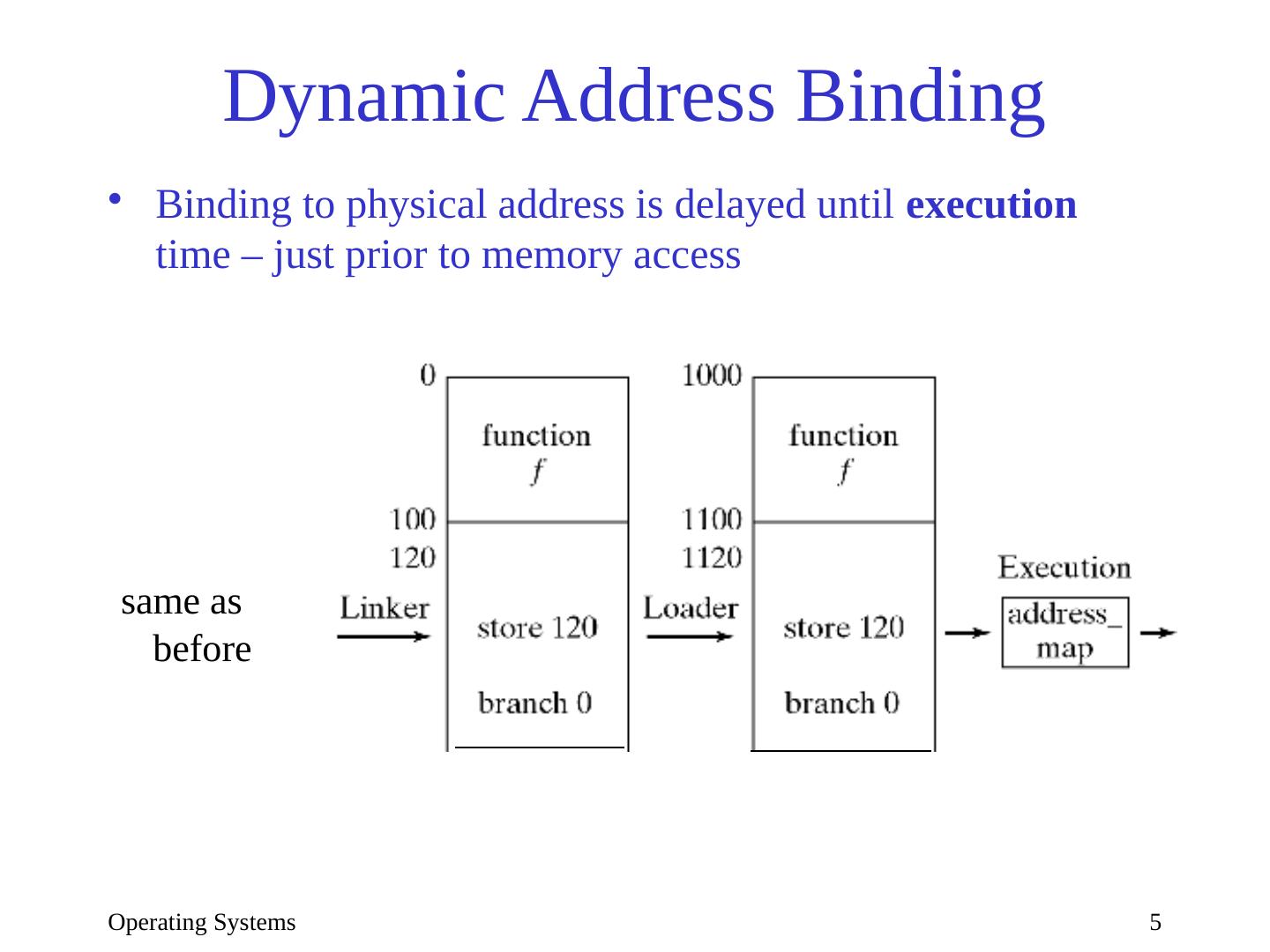5 .Operating Systems 5 Dynamic Address Binding Binding to physical address is delayed until execution time – just prior to memory access same as before