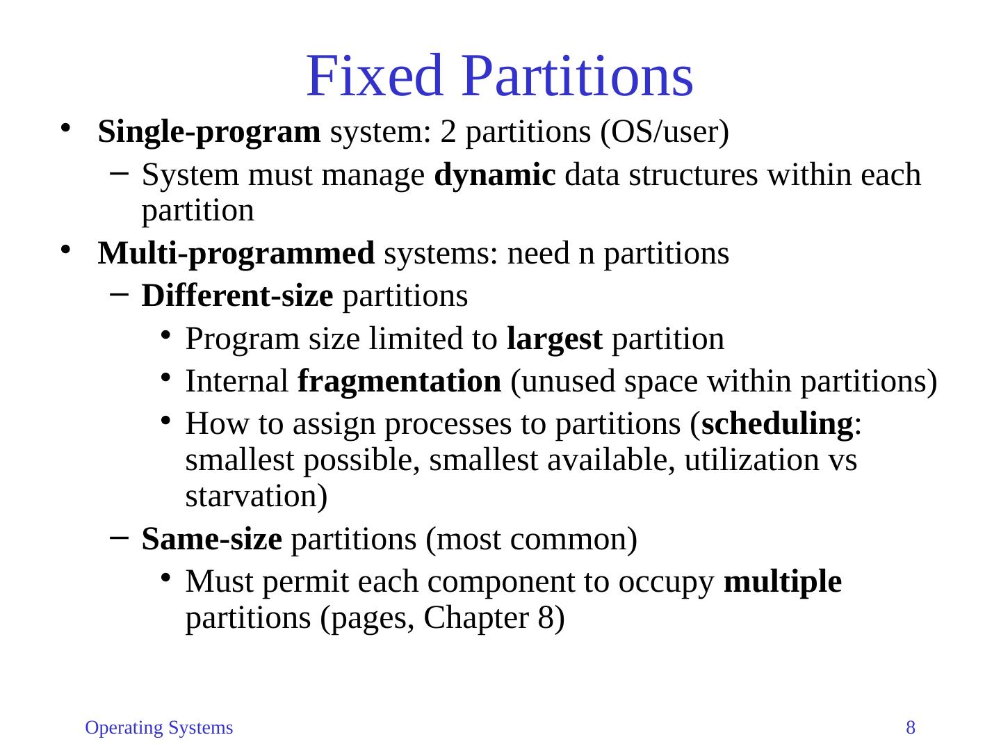 8 .Operating Systems 8 Fixed Partitions Single-program system: 2 partitions (OS/user) System must manage dynamic data structures within each partition Multi-programmed systems: need n partitions Different-size partitions Program size limited to largest partition Internal fragmentation (unused space within partitions) How to assign processes to partitions ( scheduling : smallest possible, smallest available, utilization vs starvation) Same-size partitions (most common) Must permit each component to occupy multiple partitions (pages, Chapter 8)