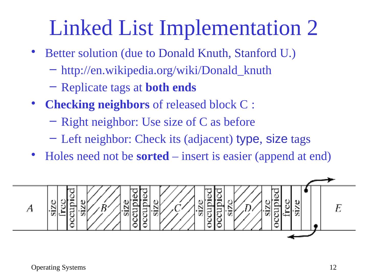 11 .Operating Systems 11 Linked List Implementation 1 Type , Size tags at the start of each b lock/hole Holes contain links to previous and next hole (why not blocks?) Checking neighbors of released block (e.g. C below): Right neighbor (easy): Use size of C Left neighbor (clever): Use sizes to find first hole to C ’s right, follow its back link to first hole on C ’s left, and check if it is adjacent to C . Holes must be sorted by physical address