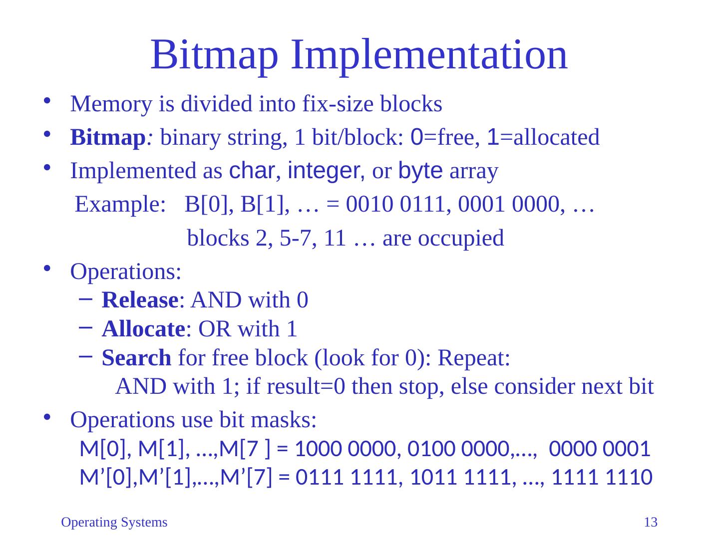 13 .Operating Systems 13 Bitmap Implementation Memory is divided into fix-size blocks Bitmap : binary string, 1 bit/block: 0 =free, 1 =allocated Implemented as char , integer, or byte array Example: B[0], B[1], … = 0010 0111, 0001 0000, … blocks 2, 5-7, 11 … are occupied Operations: Release : AND with 0 Allocate : OR with 1 Search for free block (look for 0): Repeat: AND with 1; if result=0 then stop, else consider next bit Operations use bit masks: M[0 ], M[1], …,M[7 ] = 1000 0000, 0100 0000,…, 0000 0001 M’[0],M’[1],…,M’[7] = 0111 1111, 1011 1111, …, 1111 1110