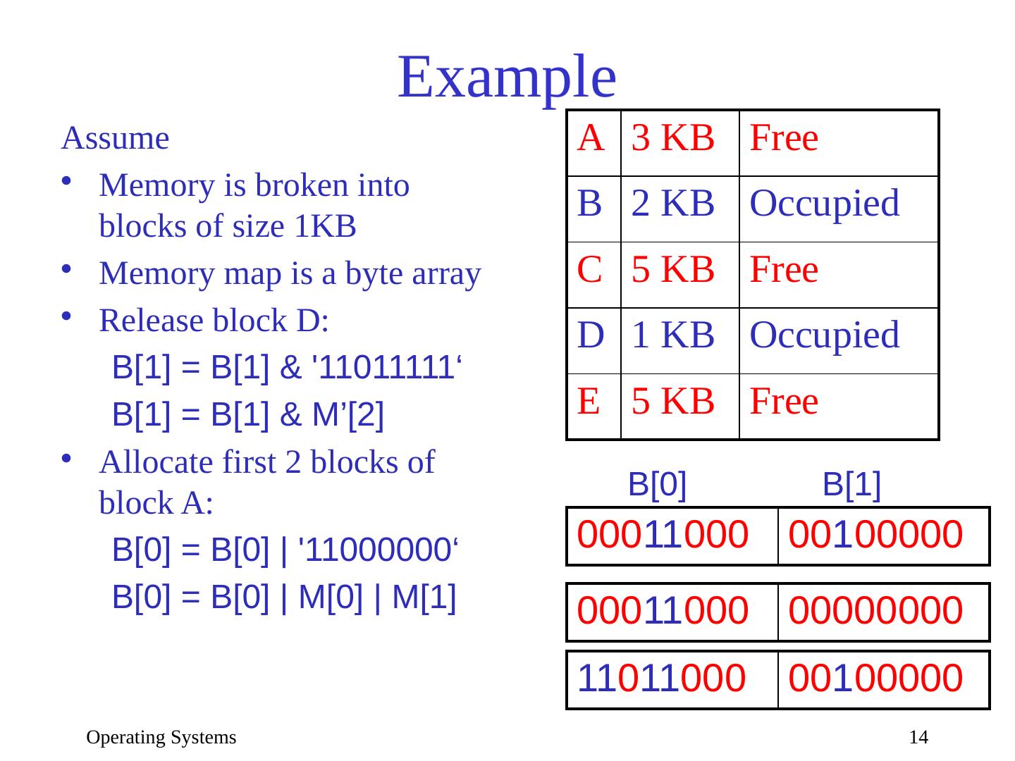 14 .Operating Systems 14 Example A 3 KB Free B 2 KB Occupied C 5 KB Free D 1 KB Occupied E 5 KB Free 000 11 000 00 1 00000 B[0] B[1] Assume Memory is broken into blocks of size 1KB Memory map is a byte array Release block D: B[1] = B[1] & 11011111‘ B[1] = B[1]