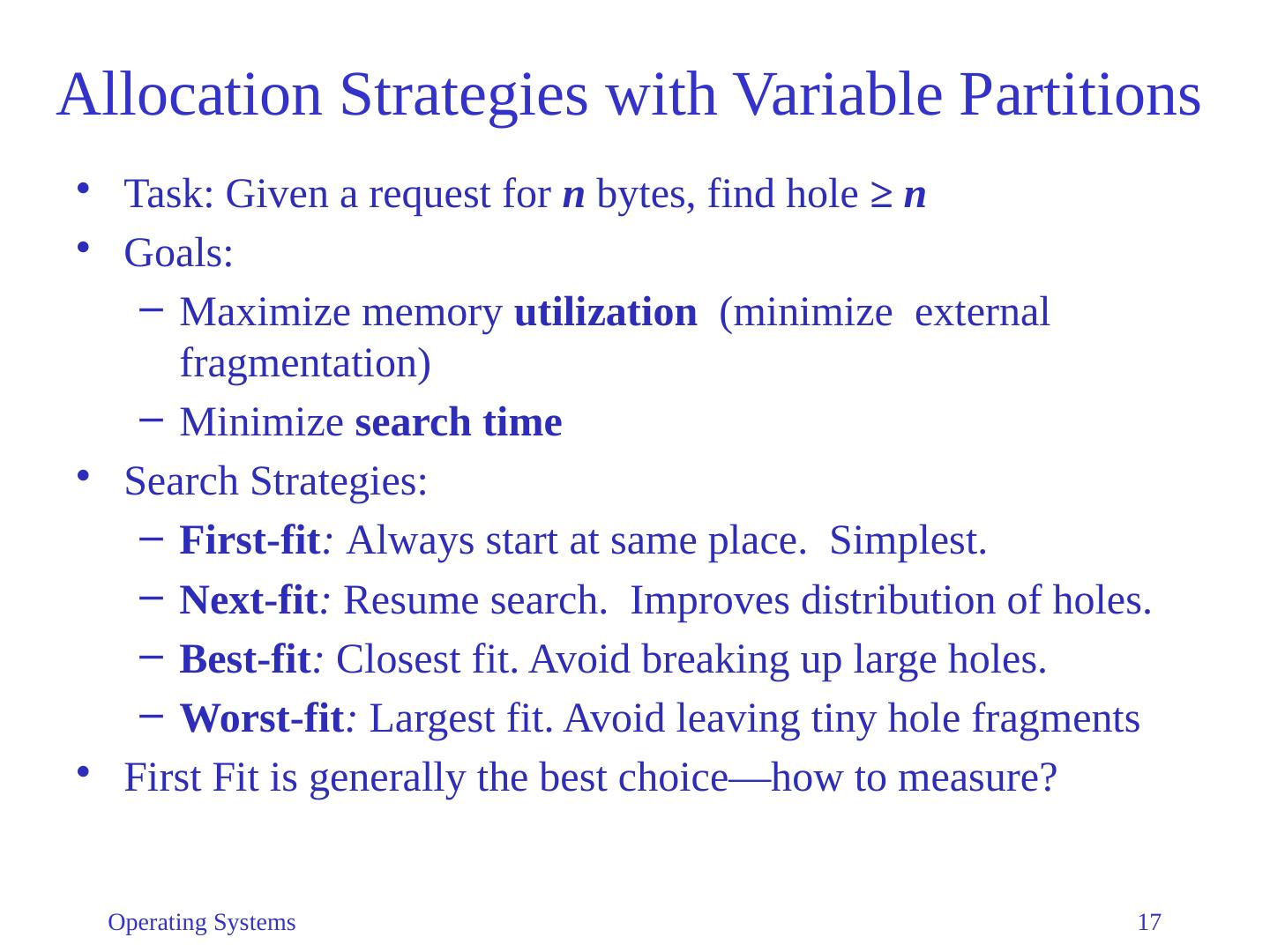 17 .Operating Systems 17 Allocation Strategies with Variable Partitions Task: Given a request for n bytes, find hole ≥ n Goals: Maximize memory utilization (minimize external fragmentation) Minimize search time Search Strategies: First-fit : Always start at same place. Simplest. Next-fit : Resume search. Improves distribution of holes. Best-fit : Closest fit. Avoid breaking up large holes. Worst-fit : Largest fit. Avoid leaving tiny hole fragments First Fit is generally the best choice—how to measure?