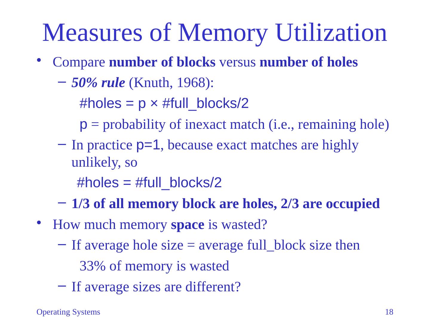 18 .Operating Systems 18 Measures of Memory Utilization Compare number of blocks versus number of holes 50 % rule (Knuth, 1968 ): # holes = p × # full_blocks /2 p = probability of inexact match (i.e., remaining hole) In practice p=1 , because exact matches are highly unlikely, so #holes = # full_blocks /2 1/3 of all memory block are holes, 2/3 are occupied How much memory space is wasted? If average hole size = average full_block size then 33% of memory is wasted If average sizes are different?