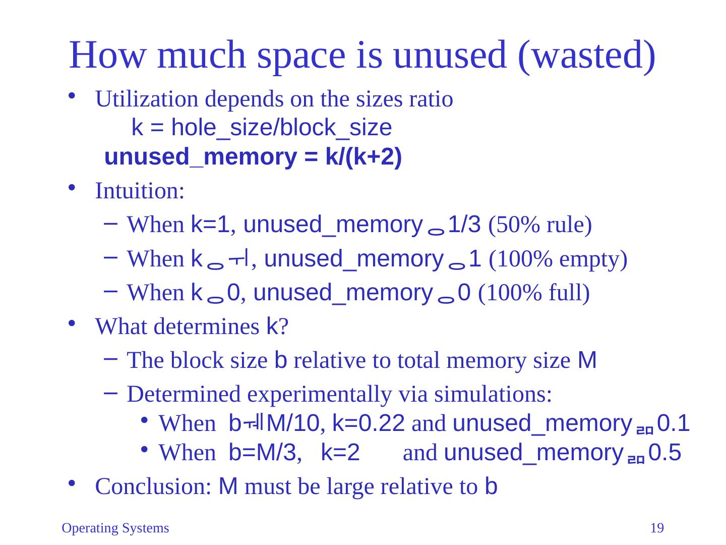 19 .Operating Systems 19 How much space is unused (wasted) Utilization depends on the sizes ratio k = hole_size / block_size unused_memory = k/(k+2) Intuition: When k=1 , unused_memory1/3 (50% rule) When k , unused_memory1 (100% empty) When k 0 , unused_memory0 (100% full) What determines k ? The block size b relative to total memory size M Determined experimentally via simulations: When bM /10 , k=0.22 and unused_memory0.1 When b=M/3 , k=2 and unused_memory0.5 Conclusion: M must be large relative to b