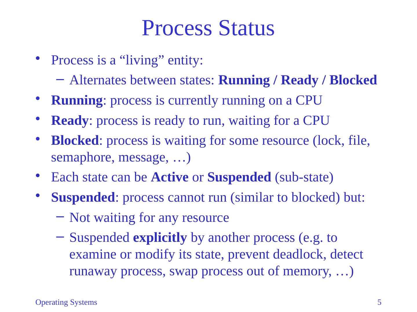 5 .Operating Systems 5 Process S tatus Process is a “living” entity: Alternates between states: Running / Ready / Blocked Running : process is currently running on a CPU Ready : process is ready to run, waiting for a CPU Blocked : process is waiting for some resource (lock, file, semaphore, message, …) Each state can be Active or Suspended (sub-state) Suspended : process cannot run (similar to blocked) but: Not waiting for any resource Suspended explicitly by another process (e.g. to examine or modify its state, prevent deadlock, detect runaway process, swap process out of memory, …)