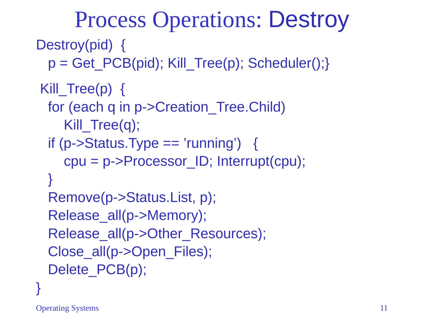 11 .Operating Systems 11 Process Operations: Destroy Destroy( pid ) { p = Get_PCB ( pid ); Kill_Tree (p); Scheduler();} Kill_Tree (p) { for (each q in p-> Creation_Tree.Child ) Kill_Tree (q ); if (p-> Status.Type == ’running’) { cpu = p-> Processor_ID ; Interrupt( cpu ); } Remove(p-> Status.List , p); Release_all (p->Memory); Release_all (p-> Other_Resources ); Close_all (p-> Open_Files ); Delete_PCB (p); }