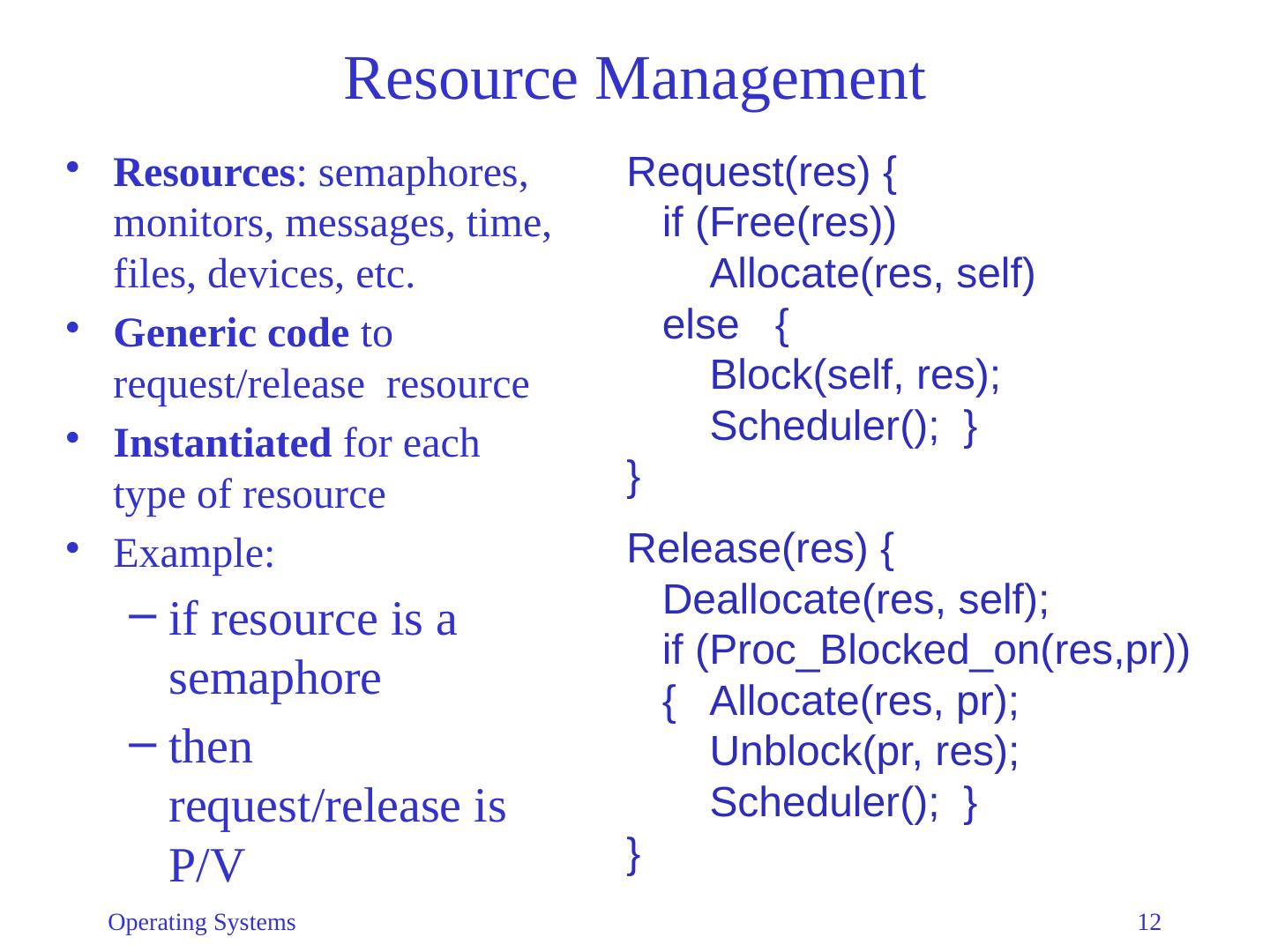 12 .Operating Systems 12 Resource Management Request(res) { if (Free(res)) Allocate(res, self) else { Block(self, res); Scheduler(); } } Release(res) { Deallocate (res, self); if ( Proc_Blocked_on ( res,pr )) { Allocate(res, pr ); Unblock( pr , res); Scheduler(); } } Resources : semaphores, monitors, messages, time, files, devices, etc. Generic code to request/release resource Instantiated for each type of resource Example: if resource is a semaphore t hen request/release is P/V