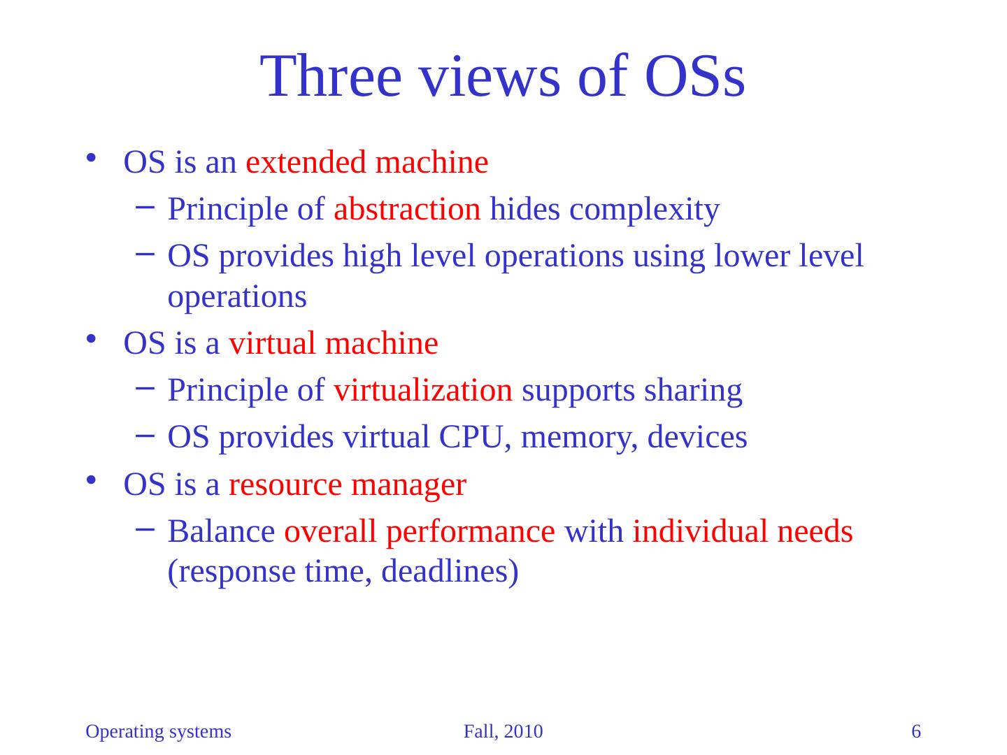 6 .Operating systems 6 Three views of OSs OS is an extended machine Principle of abstraction hides complexity OS provides high level operations using lower level operations OS is a virtual machine Principle of virtualization supports sharing OS provides virtual CPU, memory, devices OS is a resource manager Balance overall performance with individual needs (response time, deadlines) Fall, 2010