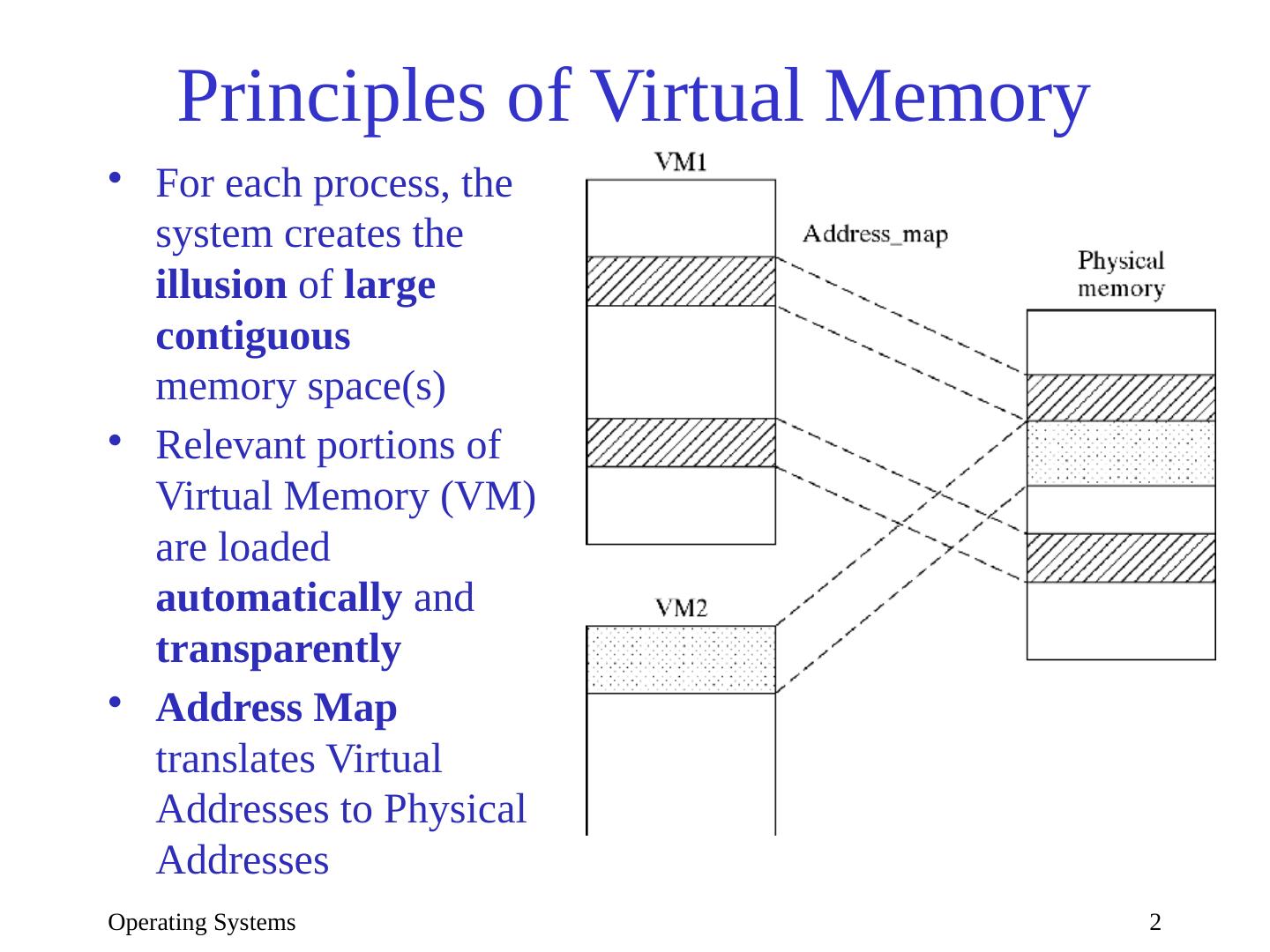 2 .Operating Systems 2 Principles of Virtual Memory For each process, the system creates the illusion of large contiguous memory space(s) Relevant portions of Virtual Memory (VM) are loaded automatically and transparently Address Map translates Virtual Addresses to Physical Addresses