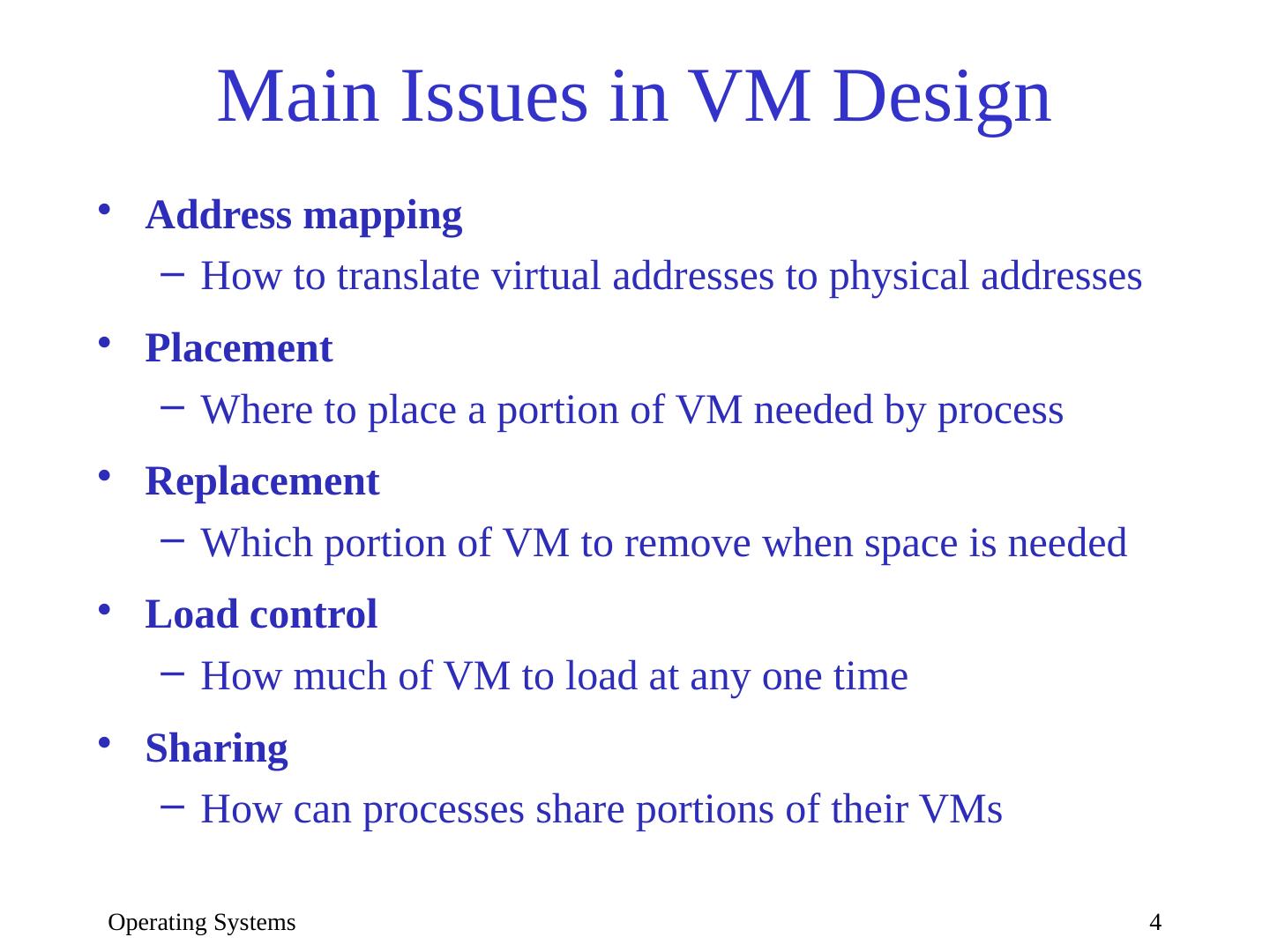 4 .Operating Systems 4 Main Issues in VM Design Address mapping How to translate virtual addresses to physical addresses Placement Where to place a portion of VM needed by process Replacement Which portion of VM to remove when space is needed Load control How much of VM to load at any one time Sharing How can processes share portions of their VMs
