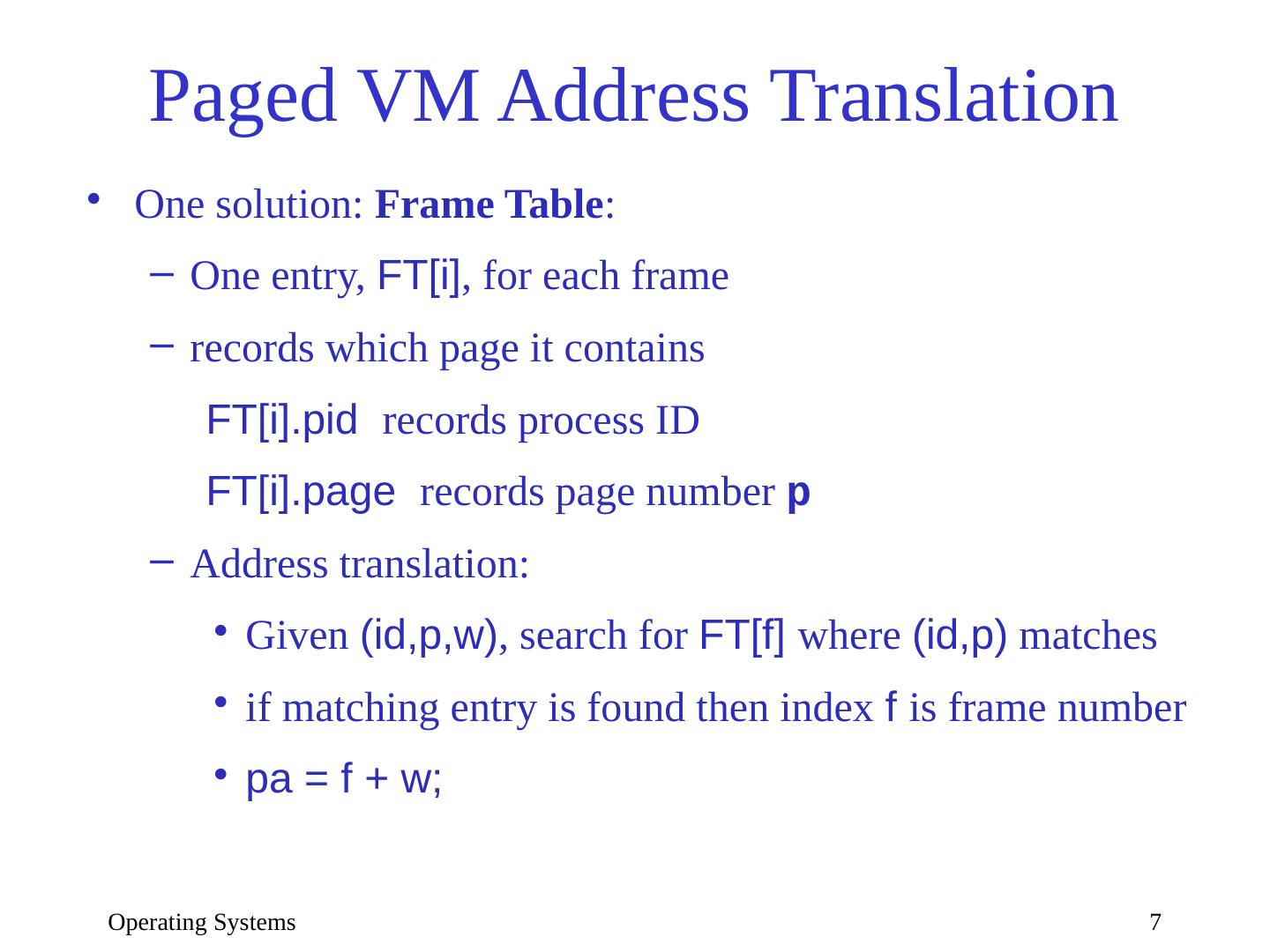 7 .Operating Systems 7 Paged VM Address Translation One solution: Frame Table : One entry, FT[i] , for each frame records which page it contains FT[i]. pid records process ID FT[i].page records page number p Address translation: Given ( id,p,w ) , search for FT[f] where ( id,p ) matches if matching entry is found then index f is frame number pa = f + w;