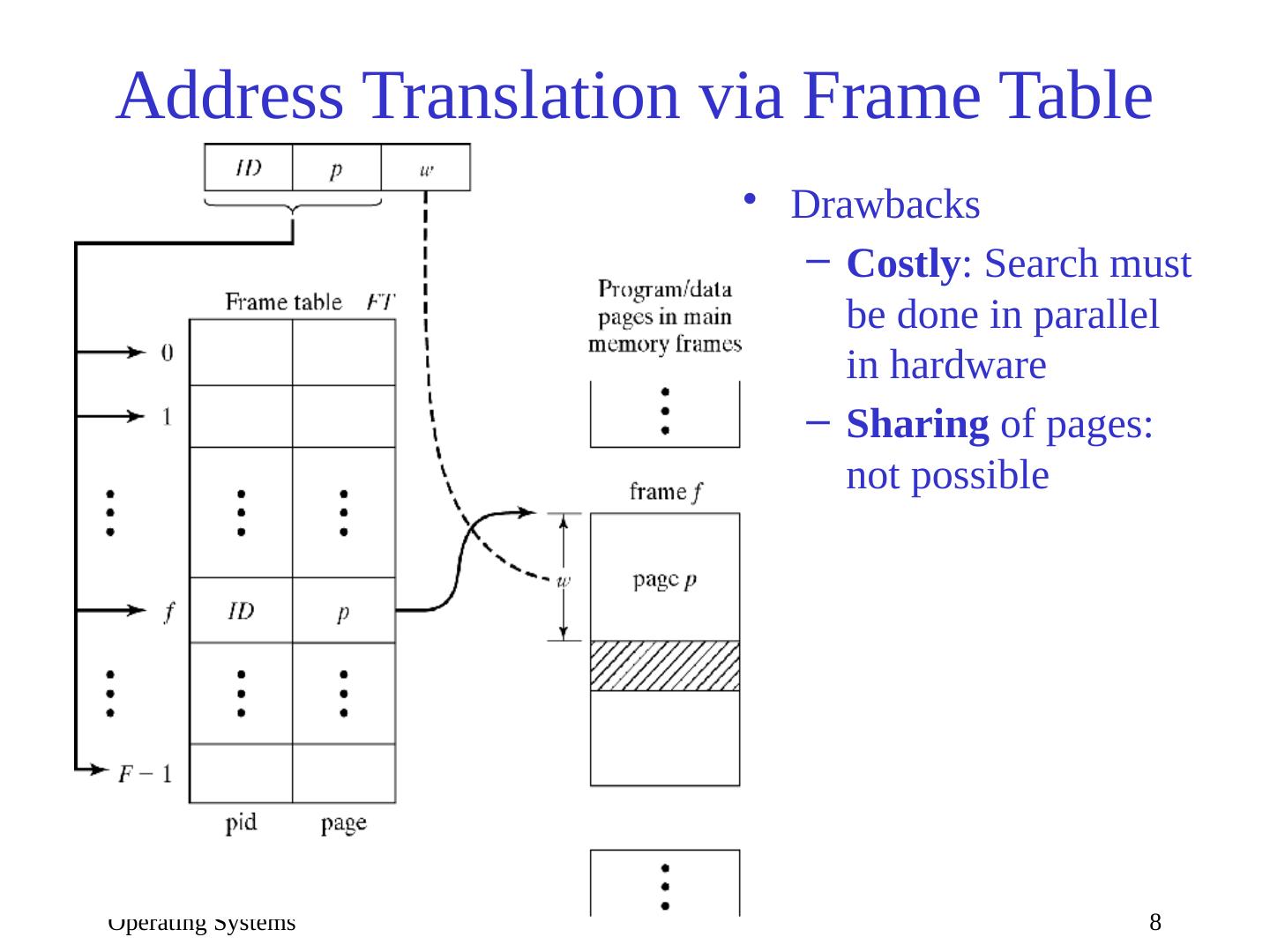 8 .Operating Systems 8 Address Translation via Frame Table Drawbacks Costly : Search must be done in parallel in hardware Sharing of pages: not possible