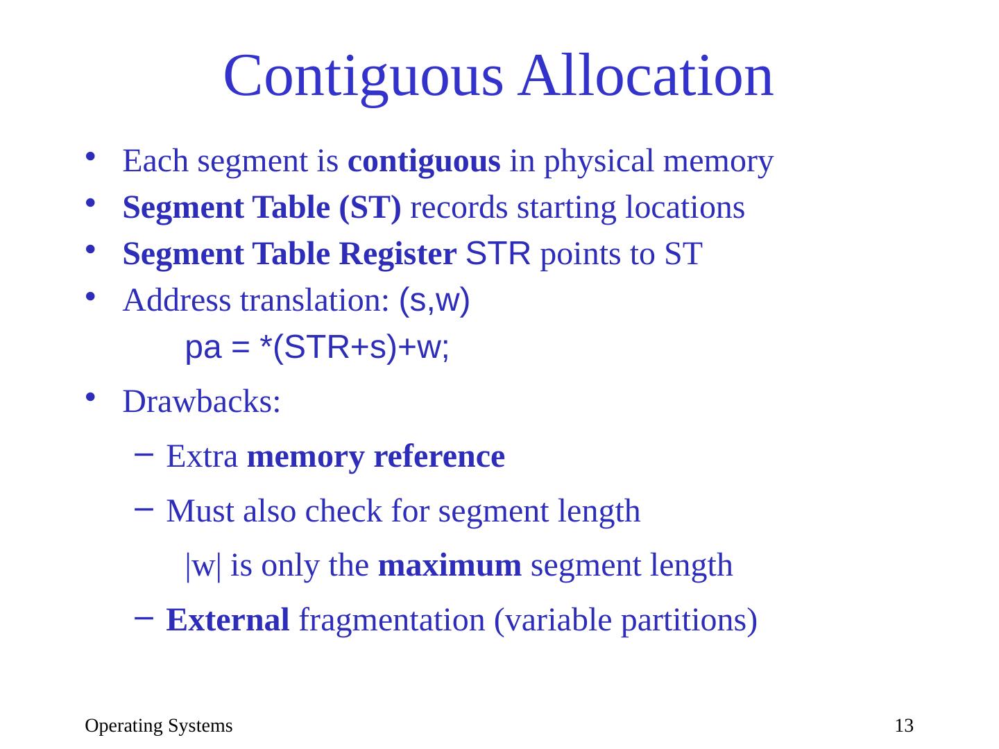 13 .Operating Systems 13 Contiguous Allocation Each segment is contiguous in physical memory Segment Table (ST) records starting locations Segment Table Register STR points to ST Address translation: ( s,w ) pa = *(STR+s)+w; Drawbacks : Extra memory reference Must also check for segment length |w| is only the maximum segment length External fragmentation (variable partitions)
