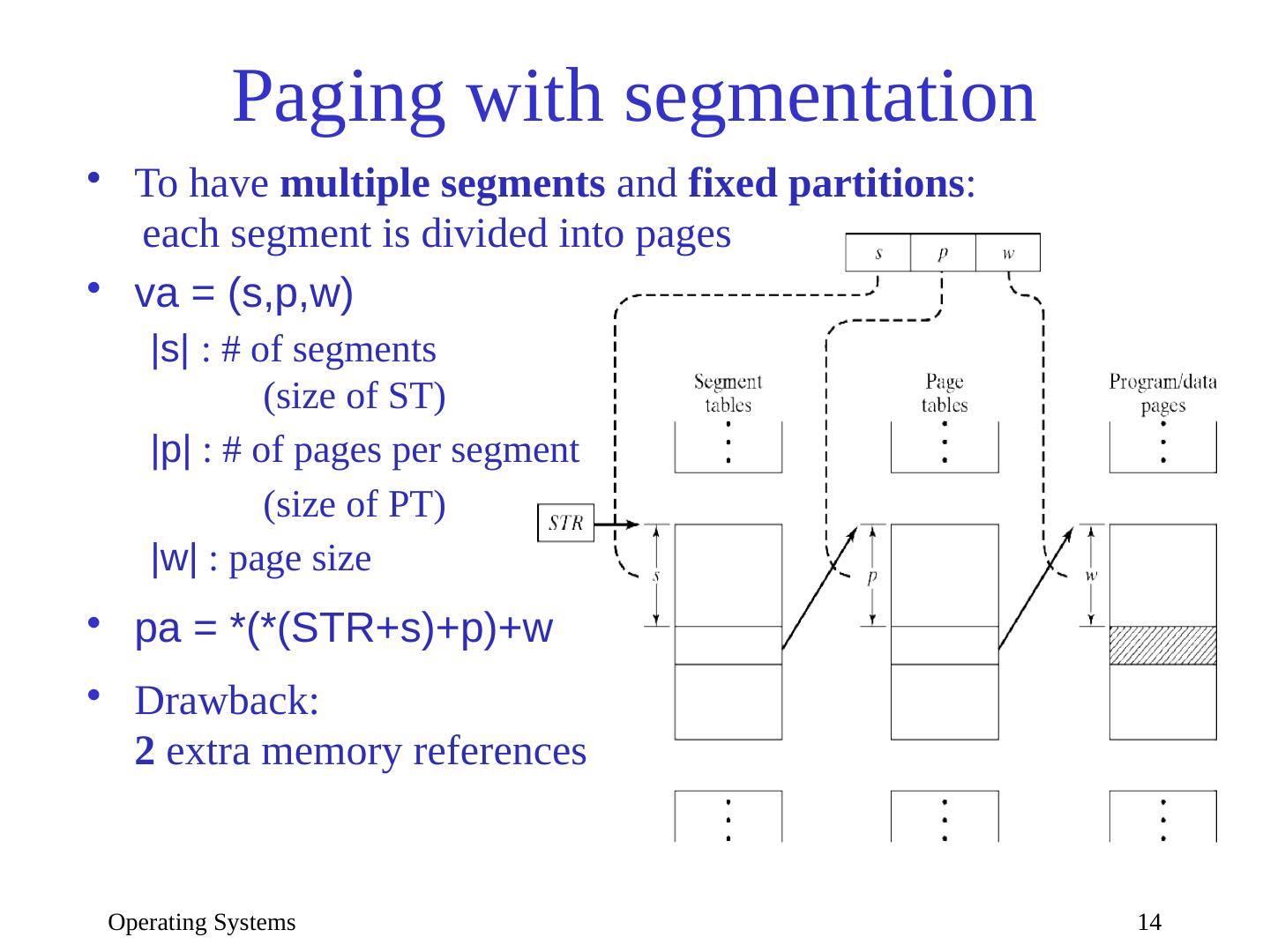 14 .Operating Systems 14 Paging with segmentation To have multiple segments and fixed partitions : each segment is divided into pages va = ( s,p,w ) |s| : # of segments (size of ST) |p| : # of pages per segment (size of PT) |w| : page size pa = *(*(STR+s)+p)+w Drawback: 2 extra memory references