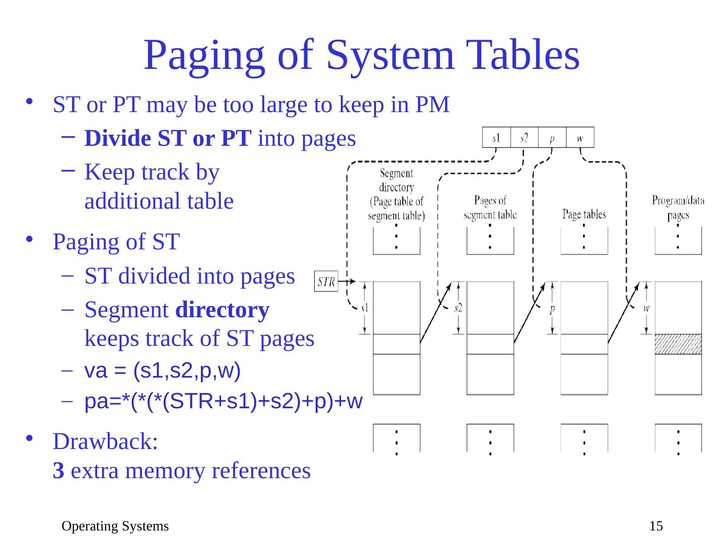 15 .Operating Systems 15 Paging of System Tables ST or PT may be too large to keep in PM Divide ST or PT into pages Keep track by additional table Paging of ST ST divided into pages Segment directory keeps track of ST pages va = (s1,s2,p,w) pa=*(*(*(STR+s1)+s2)+p)+w Drawback: 3 extra memory references