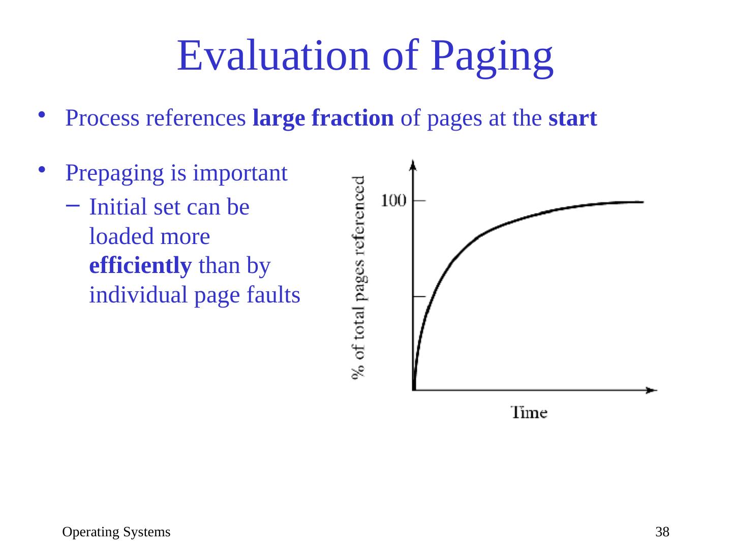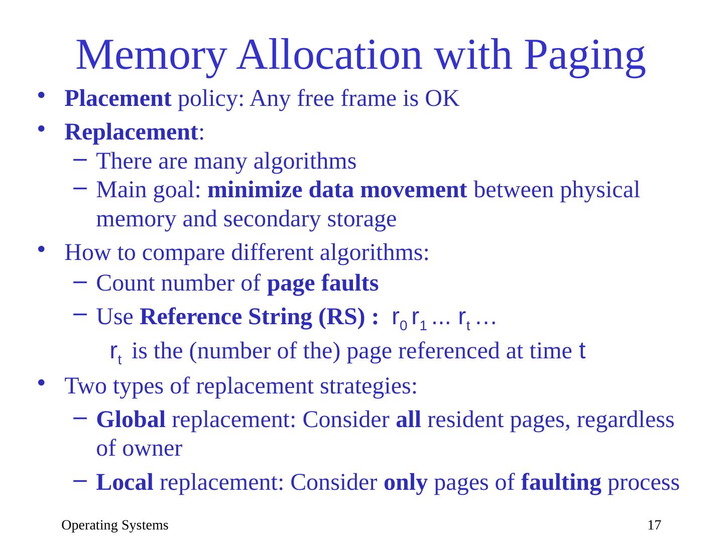 17 .Operating Systems 17 Memory Allocation with Paging Placement policy: Any free frame is OK Replacement : There are many algorithms Main goal: minimize data movement between physical memory and secondary storage How to compare different algorithms: Count number of page faults Use Reference String (RS) : r 0 r 1 ... r t … r t is the (number of the) page referenced at time t Two types of replacement strategies: Global replacement: Consider all resident pages, regardless of owner Local replacement: Consider only pages of faulting process