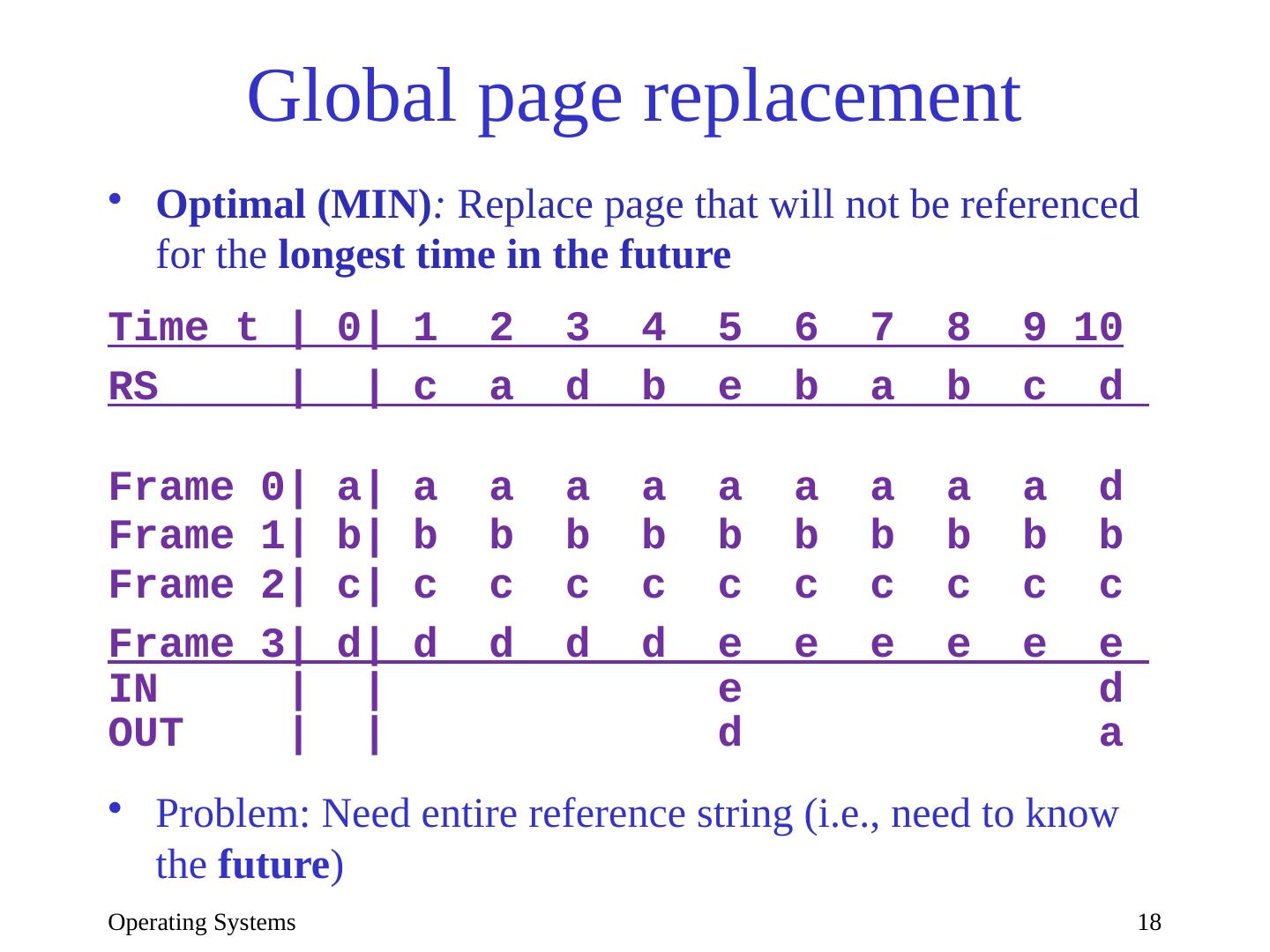 18 .Operating Systems 18 Global page replacement Optimal (MIN) : Replace page that will not be referenced for the longest time in the future Time t | 0| 1 2 3 4 5 6 7 8 9 10 RS | | c a d b e b a b c d Frame 0| a| a a a a a a a a a d Frame 1| b| b b b b b b b b b b Frame 2| c| c c c c c c c c c c Frame 3| d| d d d d e e e e e e IN | | e d OUT | | d a Problem: Need entire reference string (i.e., need to know the future )