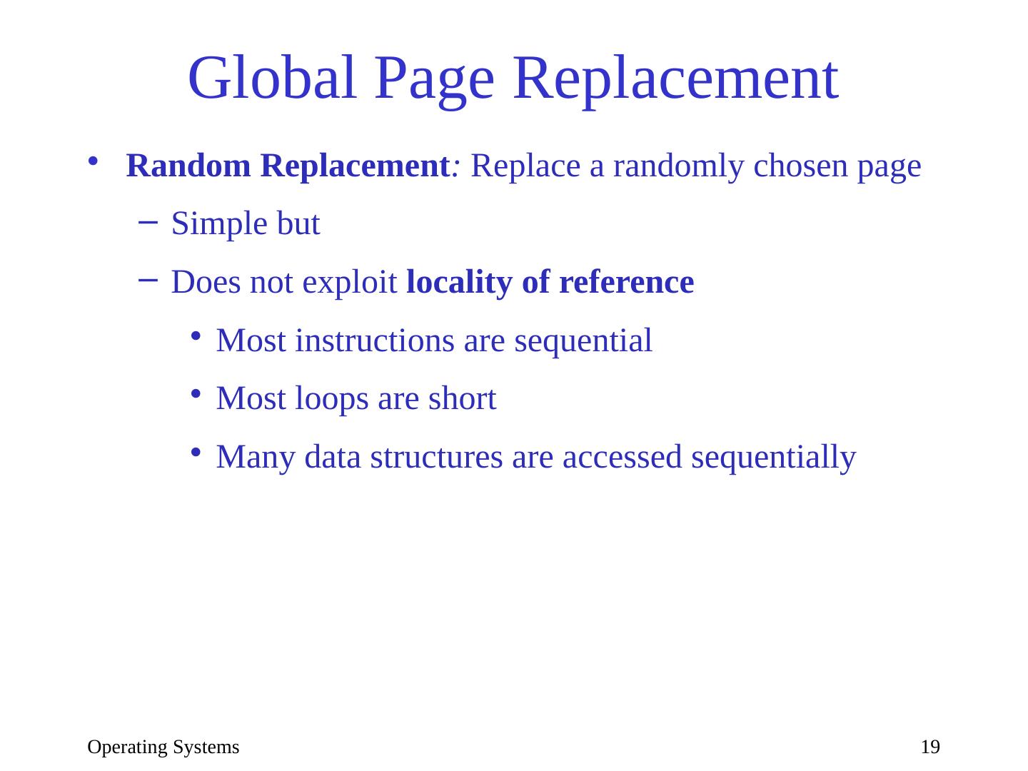 19 .Operating Systems 19 Global Page Replacement Random Replacement : Replace a randomly chosen page Simple but Does not exploit locality of reference Most instructions are sequential Most loops are short Many data structures are accessed sequentially