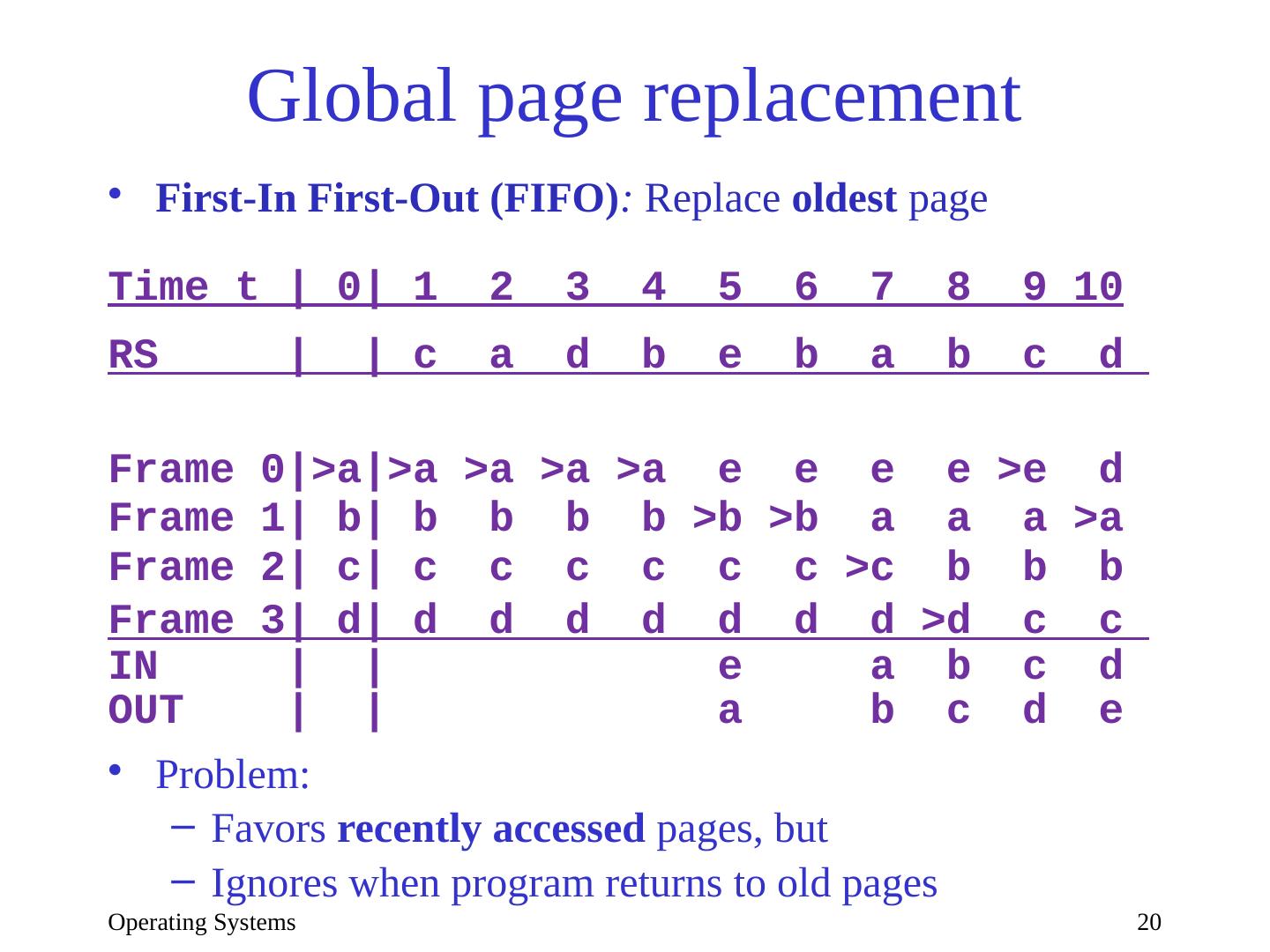 20 .Operating Systems 20 Global page replacement First-In First-Out (FIFO) : Replace oldest page Time t | 0| 1 2 3 4 5 6 7 8 9 10 RS | | c a d b e b a b c d Frame 0|>a|>a >a >a >a e e e e >e d Frame 1| b| b b b b >b >b a a a >a Frame 2| c| c c c c c c >c b b b Frame 3| d| d d d d d d d >d c c IN | | e a b c d OUT | | a b c d e Problem: Favors recently accessed pages, but Ignores when program returns to old pages