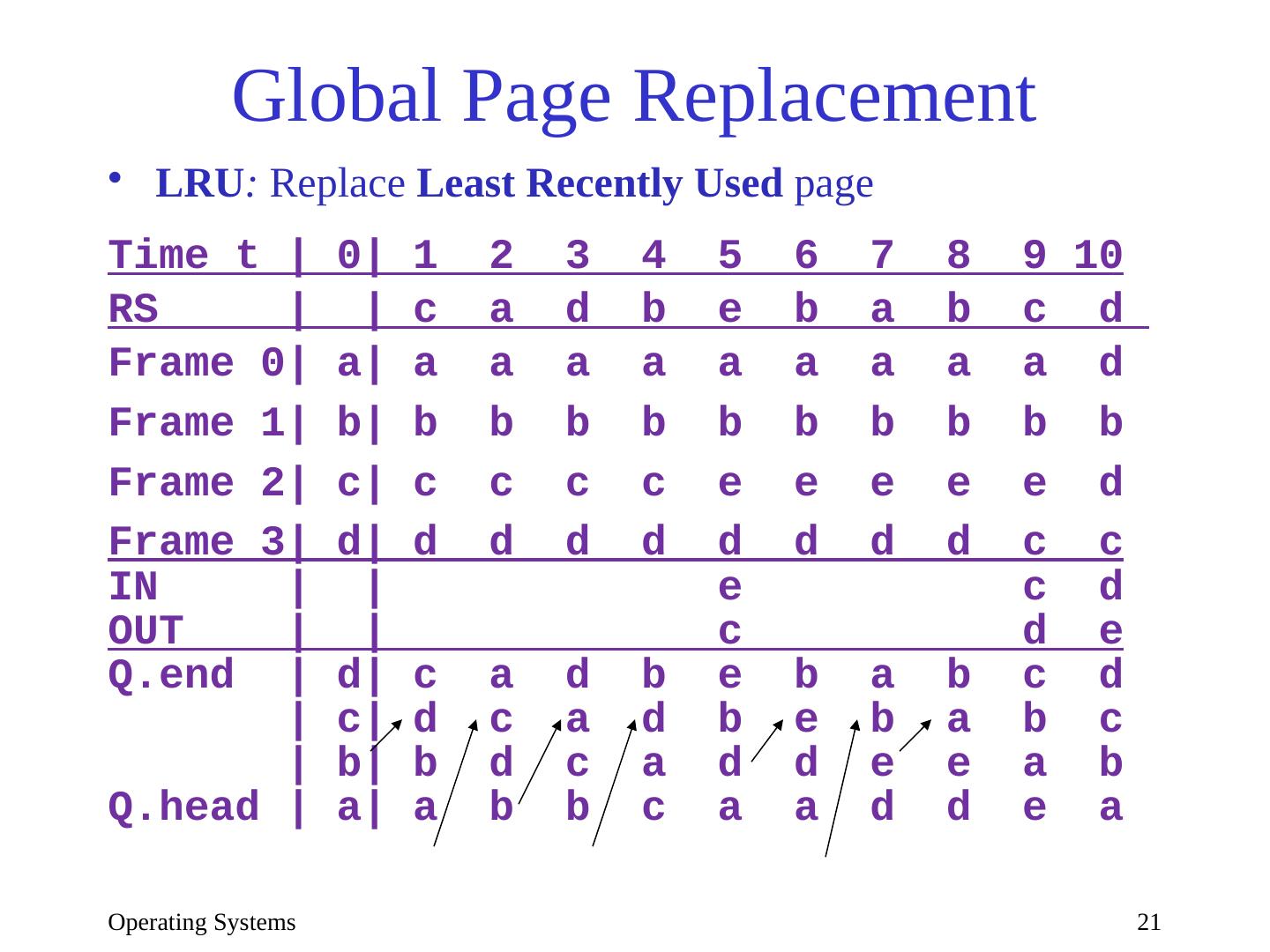 21 .Operating Systems 21 Global Page Replacement LRU : Replace Least Recently Used page Time t | 0| 1 2 3 4 5 6 7 8 9 10 RS | | c a d b e b a b c d Frame 0| a| a a a a a a a a a d Frame 1| b| b b b b b b b b b b Frame 2| c| c c c c e e e e e d Frame 3| d| d d d d d d d d c c IN | | e c d OUT | | c d e Q.end | d| c a d b e b a b c d | c| d c a d b e b a b c | b| b d c a d d e e a b Q.head | a| a b b c a a d d e a