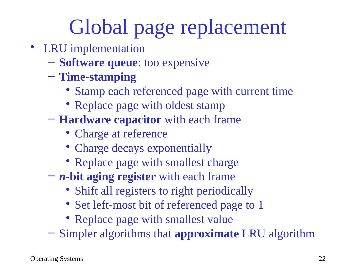22 .Operating Systems 22 Global page replacement LRU implementation Software queue : too expensive Time-stamping Stamp each referenced page with current time Replace page with oldest stamp Hardware capacitor with each frame Charge at reference Charge decays exponentially Replace page with smallest charge n -bit aging register with each frame Shift all registers to right periodically Set left-most bit of referenced page to 1 Replace page with smallest value Simpler algorithms that approximate LRU algorithm